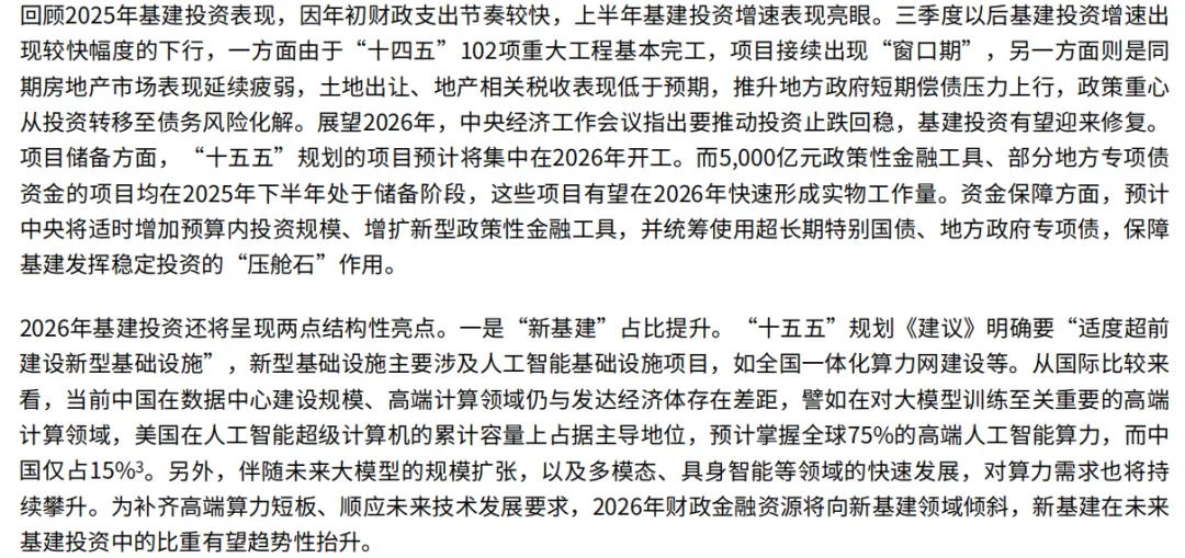 B、新基建占比提升,民间资本重回基建领域基建投资结构正在变化:AI算力网络、数据中心等新基建占比趋势性上升;政策鼓励民间资本参与铁路、核电等收益性项目,既缓解地方政府压力,也引入市场活力。基建投资正从“政府单轮驱动”转向“政府与市场双轮驱动”。