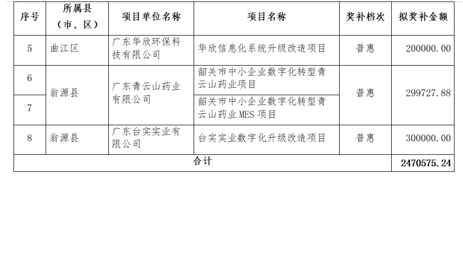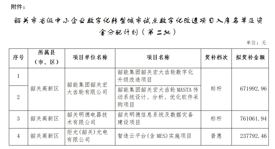 根据《韶关市工业和信息化局关于开展韶关市中小企业数字化转型城市试点数字化改造项目申报的通知》(韶工信函〔2024〕205号)要求,经组织申报和审核验收,现将韶关市省级中小企业数字化转型城市试点数字化改造项目入库名单及资金分配计划(第二批)予以公示,共支持企业6家,资金安排总计2470575.24元。
