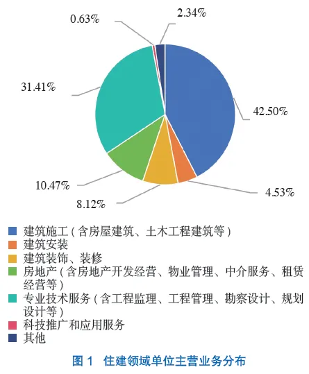 为更加深入地了解行业单位对科技人才评价工作的看法和意见建议,调研组结合走访座谈、专家访谈、标杆分析等情况编制了调查问卷,从目前行业单位科技人才评价工作现状、科技人才评价对象的类型、评价指标、评价方式、评价主体、评价周期、评价结果应用等方面设置问题,并对已开展过科技人才评价的行业单位和未开展过科技人才评价的行业单位进行了对比分析,以探究住建领域科技人才评价现实与理想的差距,分析存在的问题,提出相应的对策建议。调查问卷通过线上发放与回收,主要发放行业企业、行业社团,以及其他相关单位,填写问卷的人员主要为行业各单位人力资源部门负责人、主管或对本单位人才工作全面了解的相关工作人员。问卷回收量为735份,其中有效问卷共计640份。各单位主营业务分布情况如图1所示。其中,建筑施工、建筑安装,以及建筑装饰、装修类企业合计353家,占比55.15%;房地产类企业67家,占比10.47%;专业技术服务类企业201家,占比31.41%;科技推广和应用服务类企业4家,占比0.63%;其他类型单位15家,占比2.34%。
