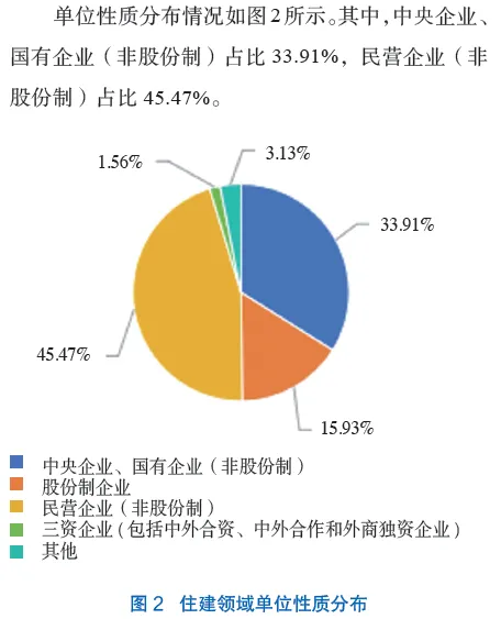单位性质分布情况如图2所示。其中,中央企业、国有企业(非股份制)占比33.91%,民营企业(非股份制)占比45.47%。