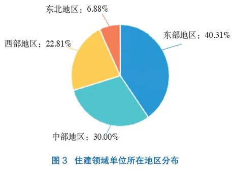 单位所在地区分布如图3所示。其中东部地区占比40.31%,中部地区占比30.00%,西部地区占比22.81%,东北地区占比6.88%。