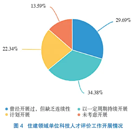 问卷调研结果显示,64.07%的单位曾经开展过或以一定周期持续开展科技人才评价工作,但仍有35.93%的单位未开展过相关工作(图4)。需要注意的是,有13.59%的单位选择“未考虑开展”,有29.69%的单位选择“曾经开展过,但缺乏连续性”,占比相当高。这在一定程度上反映出住建领域内一些单位对科技人才评价工作不够重视,近1/3的单位在开展科技人才评价工作时存在不稳定、不持续的情况,其科技人才评价工作开展不够充分,开展的持续性有待加强。