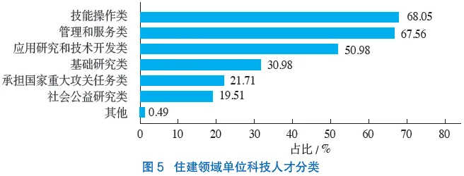 问卷调研结果显示:技能操作类人才占比最高,达到68.05%;管理和服务类、应用研究和技术开发类人才也占据较大比例,分别为67.56%和50.98%(图5);基础研究类、承担国家重大攻关任务类和社会公益研究类人才占比较小。这说明住建领域各单位的科技人才以技能操作类、管理和服务类、应用研究和技术开发类为主。