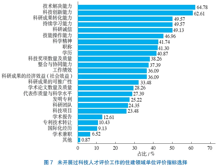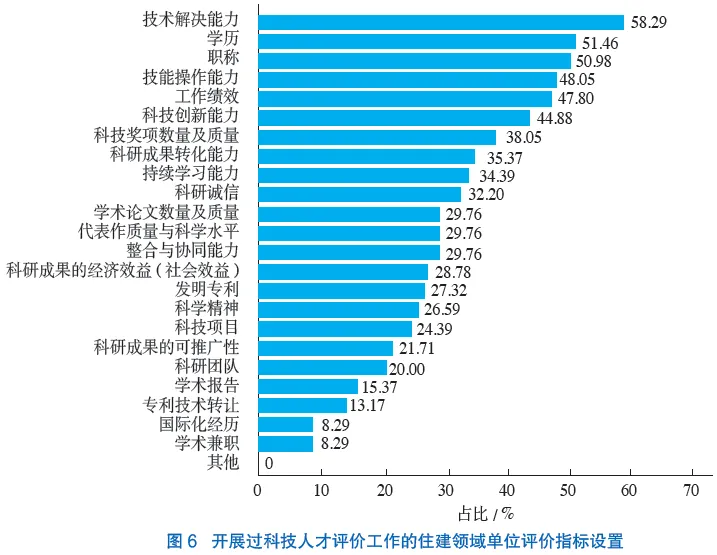 在开展过科技人才评价工作的单位中,问卷调研结果显示,选择比例最多且在50%以上的指标为“技术解决能力”(58.29%)、“学历”(51.46%)、“职称”(50.98%);选择比例为40%~50%的指标为“技能操作能力”(48.05%)、“工作绩效”(47.80%)、“科技创新能力”(44.88%);其余指标选择比例较低,均在40%以下(图6)。由此可以看出,住建领域现有科技人才评价较侧重于设置“学历”“职称”“工作绩效”这些外显的、强调过往成就的、易于定量评价的指标,而在一定程度上轻视了如“持续学习能力”“科研诚信”“科学精神”等隐性的、潜在的、不易于定量评价的指标。