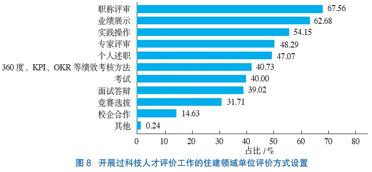 问卷调研结果显示,在开展过科技人才评价工作的住建领域单位中,选择比例最多的评价方式为“职称评审”(67.56%),其次为“业绩展示”(62.68%)、“实践操作”(54.15%)等(图8)。由此可见,住建领域现有科技人才评价方式较为陈旧,过度依赖职称评审,同时在一定程度上反映出较多行业单位将科技人才评价与职称评审简单等同,对科技人才评价的理解存在偏差。