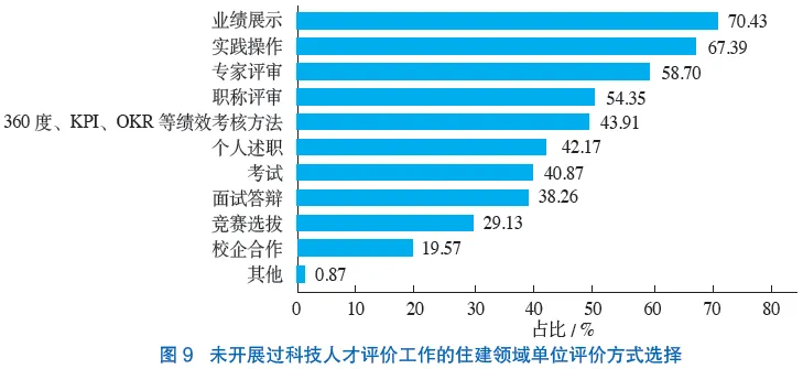 问卷调研结果显示,在未开展过科技人才评价工作的住建领域单位中,选择比例较多的评价方式为“业绩展示”(70.43%)、“实践操作”(67.39%)、“专家评审”(58.70%)等(图9)。