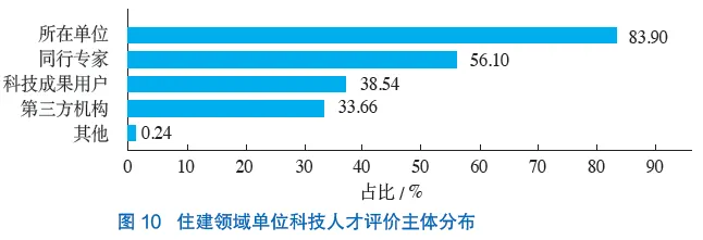 问卷调研结果显示,科技人才“所在单位”是最主要的评价主体,占比为83.90%,选择比例远超过其他评价主体;其次是“同行专家”,占比为56.10%;“科技成果用户”和“第三方机构”作为评价主体应用较少,占比分别为38.54%和33.66%(图10)。由此可见,目前住建领域科技人才评价主体过于单一,缺少多元主体参与。
