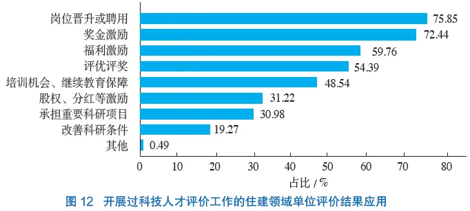 问卷调研结果显示,在开展过科技人才评价工作的住建领域单位中,“岗位晋升或聘用”“奖金激励”“福利激励”“评优评奖”是评价结果应用中最受关注的方面,占比分别为75.85%、72.44%、59.76%和54.39%,而在“培训机会、继续教育保障”“股权、分红等激励”“承担重要科研项目”“改善科研条件”方面的关注度较低,占比均在50%以下(图12)。