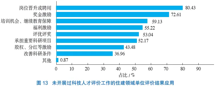 在未开展过科技人才评价工作的住建领域单位中,“岗位晋升或聘用”“奖金激励”“培训机会、继续教育保障”和“福利激励”被认为是评价结果应用应该重点考虑的方面(图13)。