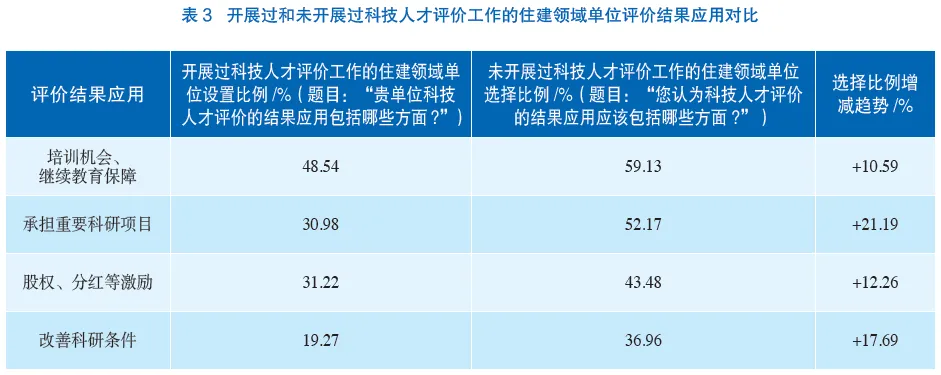 由此可见,当前住建领域的科技人才评价在结果应用方面还不够丰富,应该更加关注评价结果在培训机会与继续教育保障、重要科研项目承担、科研条件改善等方面的多元化应用。