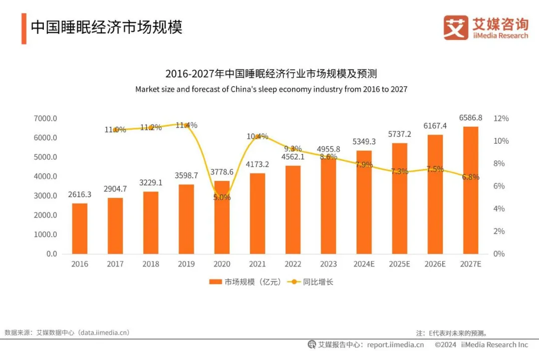 人人都想摆脱“失眠”,为此也催生了庞大的市场需求。艾媒咨询数据,中国睡眠经济市场规模从2016年的2616.3亿元增长至2023年的4955.8亿元,预计未来仍将保持增长趋势,在2027年达到6586.8亿元规模。