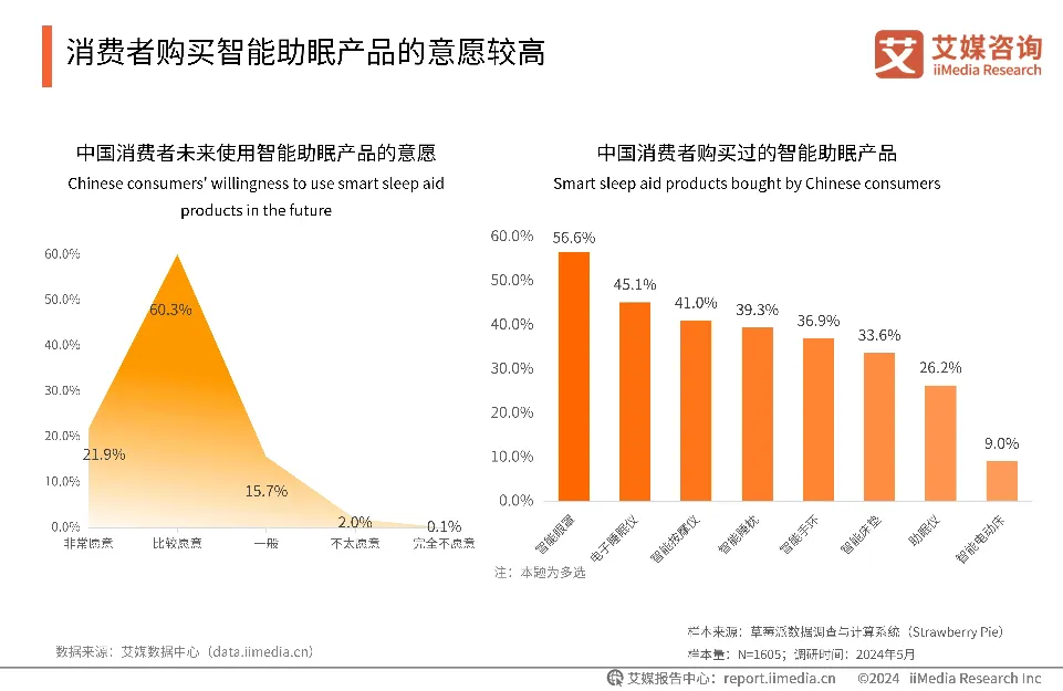 从消费者实际反馈来看,超八成消费者愿意在未来使用智能助眠设备,其中,超过三成消费者曾购买过智能睡枕、智能床垫等产品。