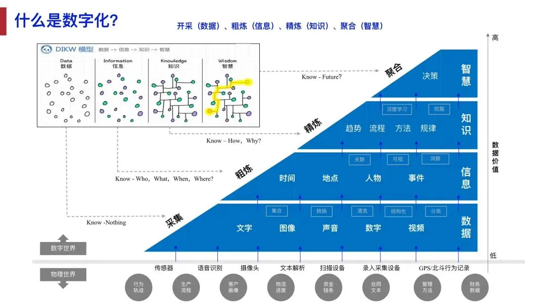 什么是数字化?用 DIKW 模型就能说透:从采集零散数据,到转化为有价值的信息,再提炼成可复用的知识,最终聚合为指导决策的智慧。对企业而言,这意味着要实现从物理世界到数字世界的全面映射,让数据贯穿业务、管理、生态全链条。