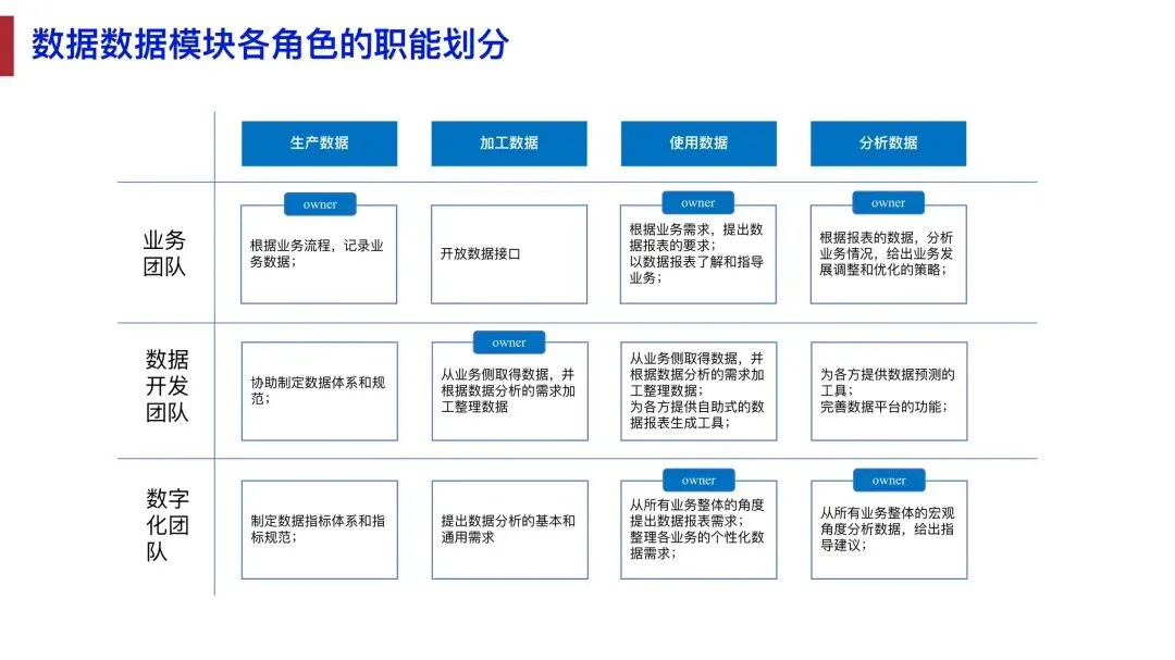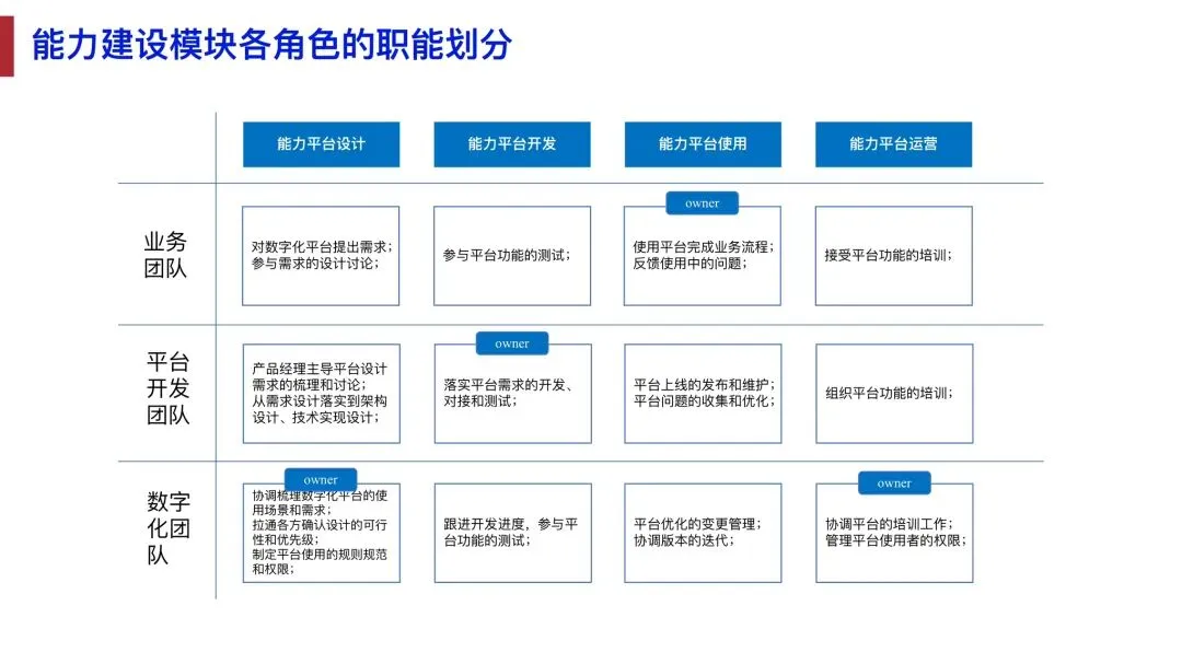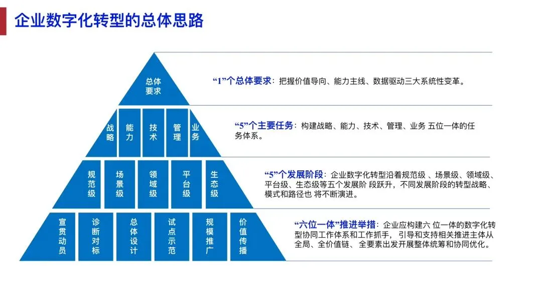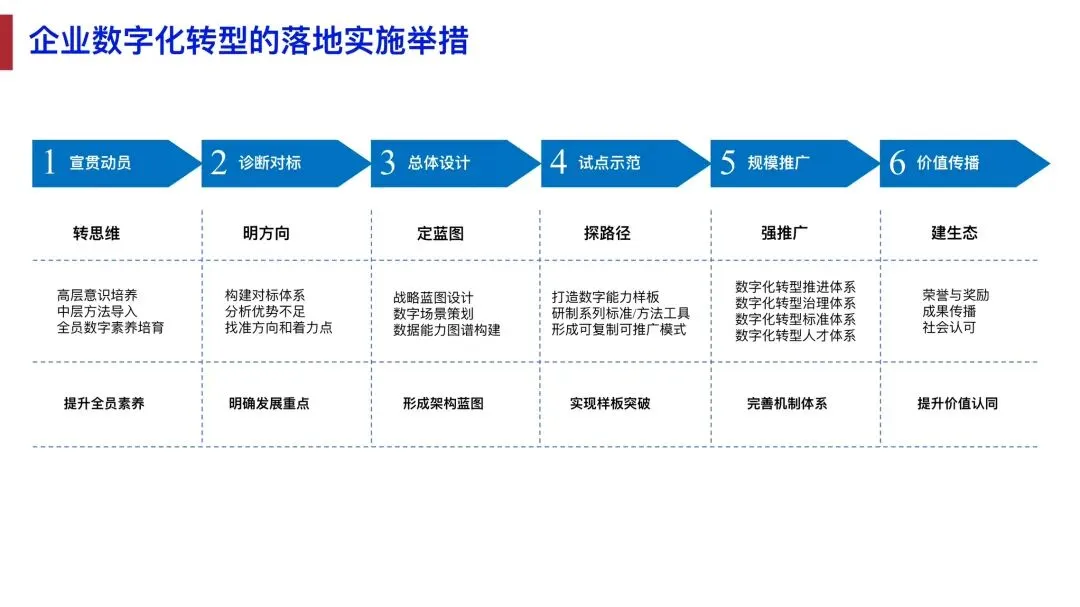 转型落地需要 “六位一体” 推进:先通过宣贯动员转变思维,再诊断对标明确方向,接着总体设计绘制蓝图,试点示范探索路径,规模推广完善机制,最后价值传播构建生态。在这个过程中,业务、技术、数字化团队需各司其职,在流程优化、能力建设、数据运营等环节形成合力。