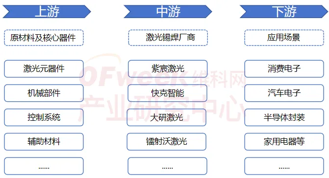 激光锡焊设备的上游原料主要包括激光元器件、机械部件、控制系统及辅助材料等。中游主要为激光锡焊机的生产商,负责将各种零部件进行集成和组装,开发控制系统软件,进行设备的调试和检测,生产出满足不同应用需求的激光锡焊机。主要包括紫宸激光、快克智能、大研激光、镭射沃激光等厂商。激光锡焊机的下游应用场景主要集中在消费电子、汽车电子、半导体封装、家用电器等领域。