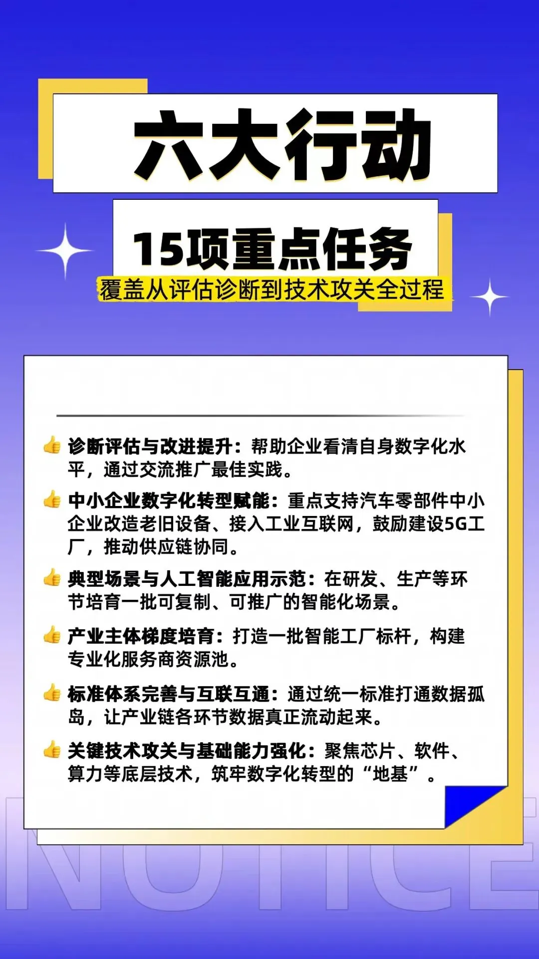 为实现上述既定目标,《实施方案》部署了“六大行动”,涵盖15项重点任务。一是开展诊断评估与改进提升行动,完善诊断评估体系,推动企业自评与诊断,加强行业内外交流和经验推广。二是汽车零部件中小企业数字化转型赋能行动,梯次推进汽车零部件中小企业数字化转型,重点开展“哑”设备改造和关键设备更新,引导工业互联网深度应用,鼓励建设5G工厂、推广“5G+工业互联网”典型场景,推动供应链数字化协同升级,支持中小企业融入大企业供应链数字化体系。三是开展典型场景与人工智能应用示范行动,精准培育行业典型场景与解决方案,加速关键环节人工智能应用拓展。四是产业主体梯度培育与矩阵构建行动,持续开展智能工厂梯度培育推广,构建汽车行业专业化服务商资源矩阵。五是标准体系完善与互联互通保障行动,加强标准体系建设和关键标准研制,以标准化保障数据互联互通。六是关键技术攻关与基础能力强化行动,聚焦关键技术产品攻关,强化专用算力及先进通信基础能力建设,完善数据安全保护体系与技术能力。