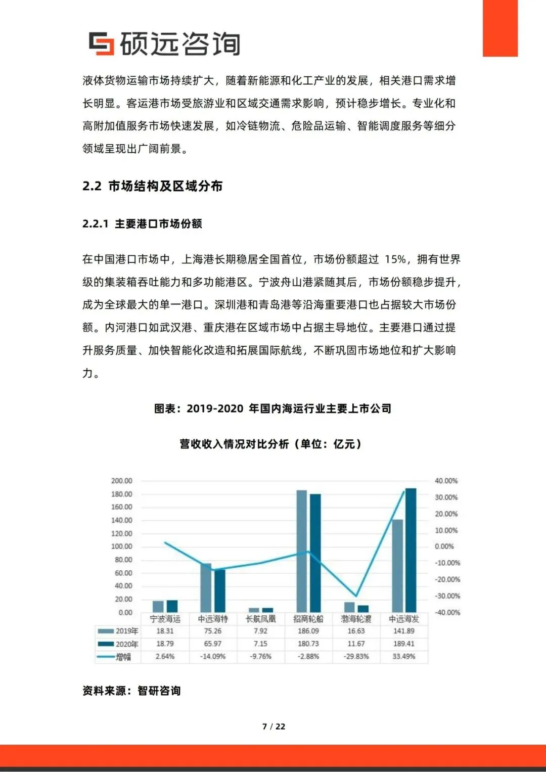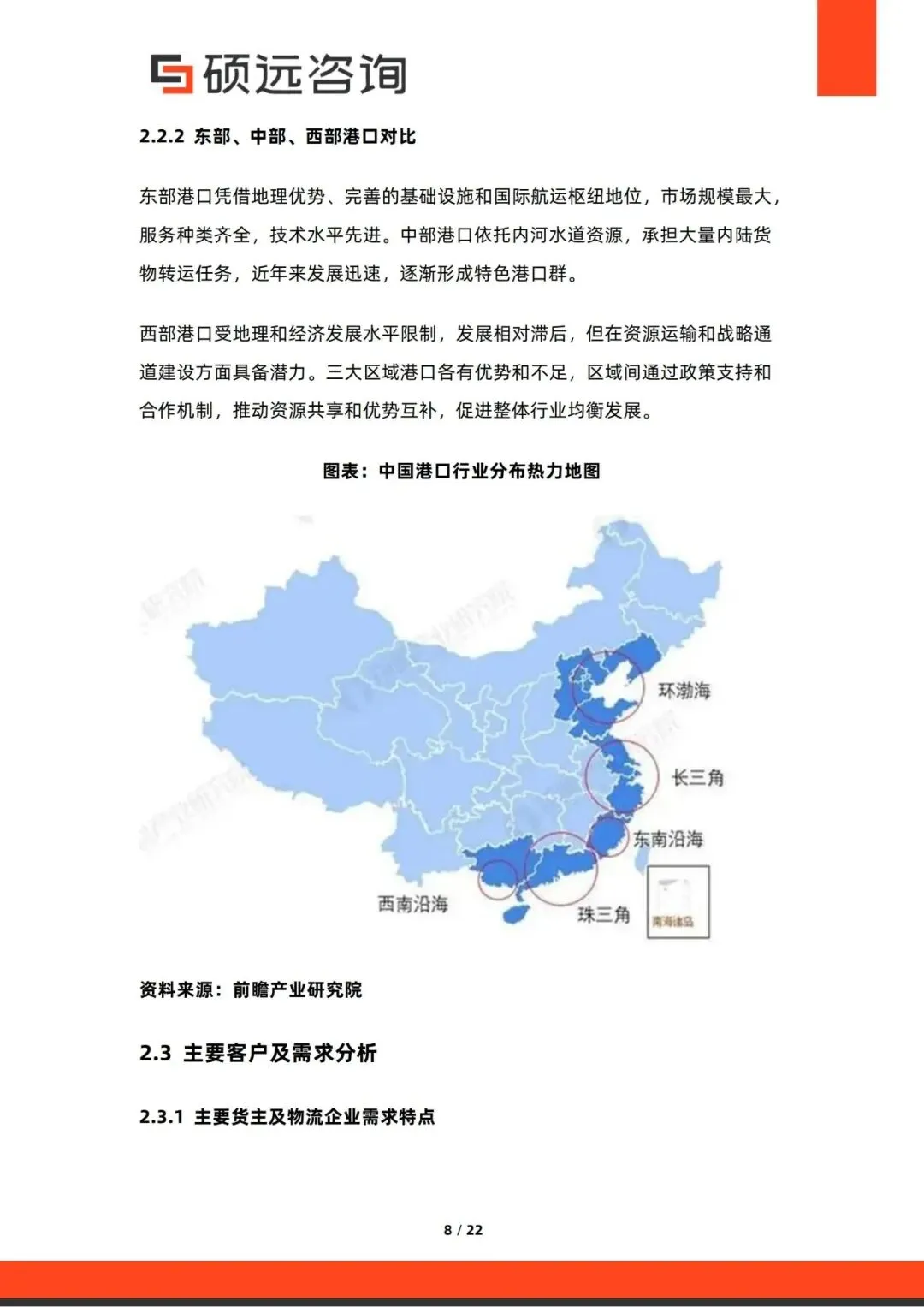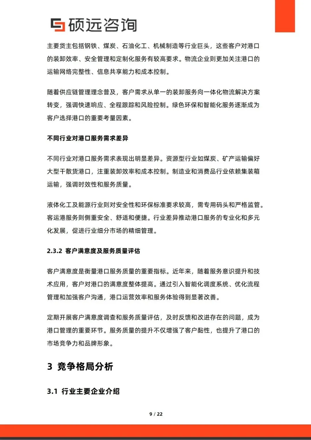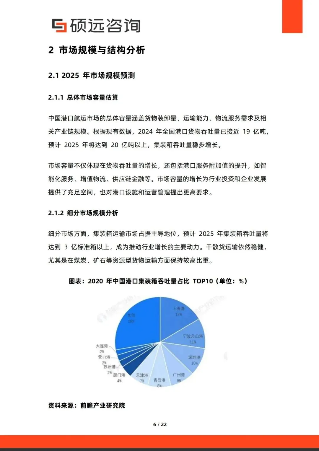 本篇行业报告可以通过扫下方知识星球下载。39元就可以下载星球所有报告。免费提供报告查找服务。中国港口航运行业正站在转型升级的重要关口。根据2025年市场预测,全国港口货物吞吐量将突破20亿吨,集装箱吞吐量超3亿标准箱,市场规模持续扩大,为行业发展注入强劲动能。当前,智能化与绿色化已成为行业发展的双引擎。在政策强力支持下,港口企业加速推进自动化码头、智能调度系统和物联网技术应用,实现作业流程的精准管理和效率跃升。无人驾驶堆高机、自动引导车等设备的引入,不仅降低人力成本,更将安全管理提升至新高度。同时,为响应国家"双碳"目标,清洁能源应用全面铺开,岸电系统、LNG动力船舶和氢燃料技术逐步替代传统能源,推动港口向低碳化、可持续方向转型。市场格局呈现高度集中特征。CR3指标超过50%,CR5达70%以上,以上海港、宁波舟山港为代表的国有大型港口集团占据主导地位,凭借规模效应和综合服务优势不断巩固市场地位。与此同时,民营与外资企业以灵活机制和差异化服务在细分市场快速崛起,新兴科技企业则通过数字化解决方案为传统港口注入创新活力,形成多元化竞争生态。然而,行业仍面临多重挑战。全球经济波动与贸易摩擦直接影响货运需求,客户供应链调整加剧市场不确定性;设备故障与安全事故风险不容忽视,而人工智能、大数据等领域技术人才短缺更成为智能化转型的瓶颈。此外,高度集中的市场结构可能抑制竞争活力,需要政策层面防范垄断风险。面向未来,行业应坚持"智能引领、绿色驱动、协同共享"的发展路径。一方面深化国际合作,积极参与"一带一路"建设,提升全球航运网络地位;另一方面推动区域港口群协同发展,优化资源配置,避免同质化竞争。企业需强化风险预警机制,加大人才培养力度,通过技术创新和服务升级构建核心竞争力,在全球贸易新格局中实现高质量、可持续发展。免责声明:以上分享报告为公开合法渠道获得,内容大部分来源于网络,版权归原作者所有,如有侵权,请及时与我们联系,我们将第一时间保障您的权益。推荐内容仅供参考学习,不构成投资建议。