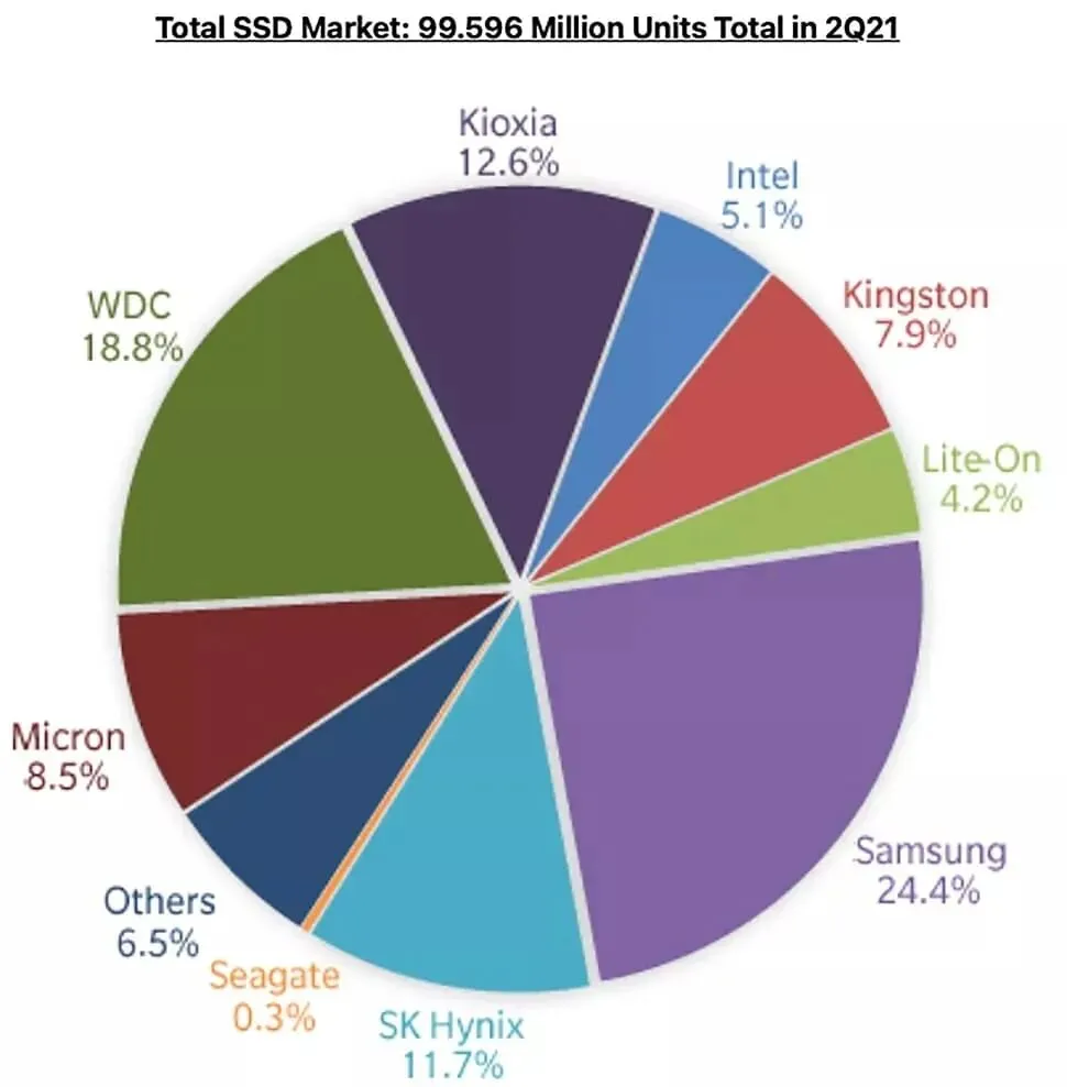 在固态硬盘发展初期,固态硬盘虽然速度快其价格非常高,而随着技术的发展,近年来SATA固态硬盘甚至是NVMe固态硬盘的价格都逐渐降低,许多NVMe固态的价格已经下探到了1GB/元以下,所以也有越来越多的用户选择固态硬盘。近期研究机构Trendfocus发布了2021年二季度存储市场的出货报告。报告显示,2021年第二季度,三大硬盘制造厂商希捷、西部数据和东芝的硬盘出货量总计达到了350.7艾字节,创造新的历史记录。其中,希捷今年第二季度出货了2817万块硬盘,继续位列第一,西部数据紧随其后,其第二季度硬盘的出货量为2540万块,第三是东芝,硬盘出货量为1398万块。在硬盘的类别上,SSD固态硬盘的总出货为9960万块,比同期的机械硬盘多出47%。不过,机械硬盘依靠其大容量、性价比高的优势,在容量上仍占据优势,其出货总容量为350.7EB,SSD则只有68.63EB。在消费级SSD中,M.2固态硬盘占据了固态硬盘市场出货量的绝大多数,共出货7148万块。企业级SSD中,PCIe和SATA仍然打得火热,出货量都在580万块左右,而SAS接口固盘则只有110万块。厂商方面,三星仍旧是全球SSD排行第一的厂商,出货量份额占24.4%,出货容量份额占34.9%。2~10名分别是西部数据,占比18.8%;铠侠(原东芝)占比12.6%;SK海力士占比11.7%;镁光占比8.5%;金士顿占比7.9%,剩下的便是英特尔、建兴、希捷和其它等。