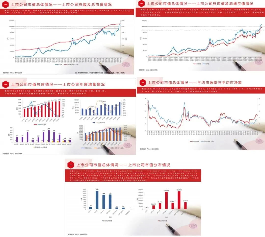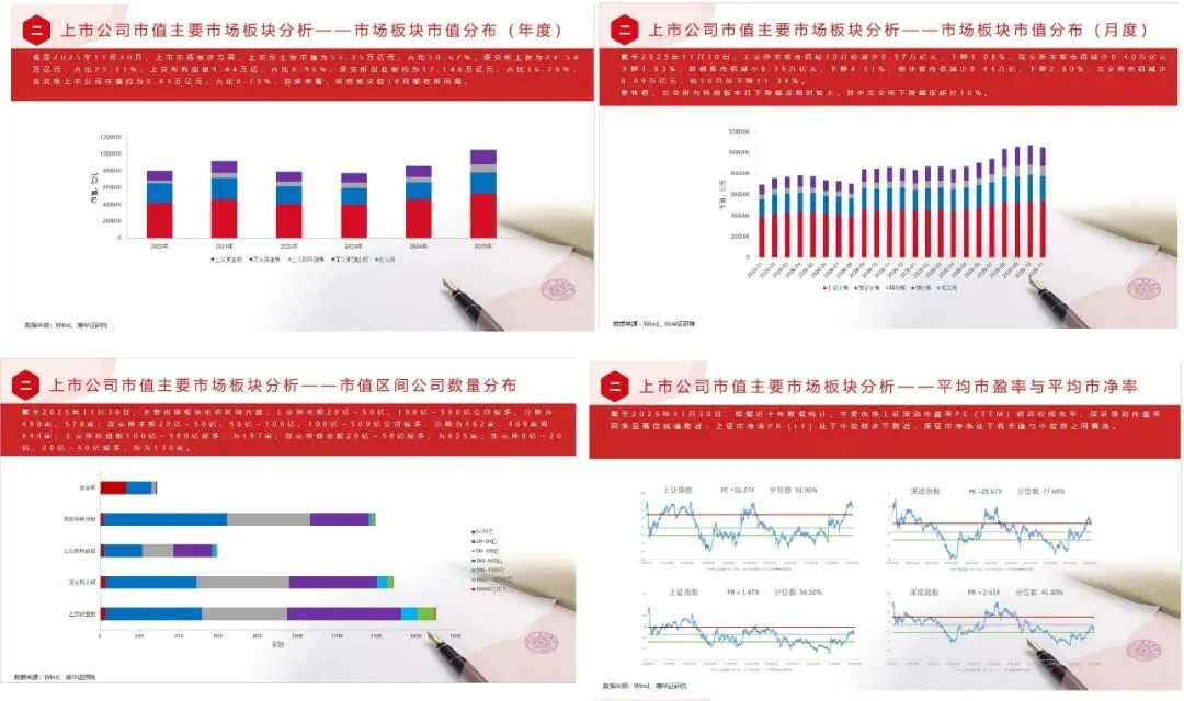 截至2025年12月,中国A股市场整体规模持续增长。上市公司总数5470家,总市值达108.89万亿元,较上月增长3.26%;流通市值98.75万亿元,创历史新高。市场平均市盈率与市净率分别为22.330和1.840,估值水平有所修复。市值分布呈两极化,100亿以下公司占比65.12%,但百亿以上中大型公司和20亿以下小市值公司数量均有所增加。分市场板块看,上交所主板市值占比近半(49.99%),保持主导地位;所有板块市值环比均上升,其中科创板涨幅最大,达8.55%。行业方面,电子行业以12.66%的市值占比连续五个月位居A股首位;银行、电力设备行业紧随其后。有色金属、国防军工行业市值环比涨幅显著。从地域分布看,广东、浙江、江苏三省的上市公司数量最多;北京、广东、上海三地的总市值领先。青海、湖北、宁夏的市值环比增幅居前。企业属性方面,民营企业总市值占比42.29%,环比增长4.67%;国有企业总市值合计占比44.91%,环比增长1.58%。头部公司中,按总市值(含A、B、H股)排名的前20家入围门槛为6417亿元,超万亿公司达12家,其中国企占据主导。市值管理实践持续推进,截至12月,累计835家公司公告建立市值管理制度,225家公司建立估值提升计划。当月分红实施金额超2700亿元,员工持股、股权激励、股份回购及并购重组活动保持活跃。对比海外,美国上市公司总市值达92.77万亿美元,连续八个月创新高。其市值高度集中于信息技术(29.20%)、金融(17.07%)及可选消费(10.62%)行业,凸显科技与消费双轮驱动特征。