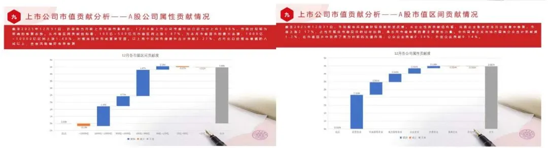 在剔除当月新上市与退市影响后,12月A股上市公司市值可比口径合计上升3.98%,市场出现较为明确的修复态势。从市值区间贡献结构看,100亿~500亿元市值区间上涨1.87%,为本月市值回升的最大来源,1000亿~10000亿区间上涨1.40%,对整体回升形成重要支撑。以上两个区间市值提升合计贡献3.27%,占可比口径整体增幅的八成以上,资金风险偏好有所修复。市场整体风险偏好较前期明显改善。从企业性质贡献结构看,民营企业板块在本月出现集中修复,市值上涨2.17%,占当月整体市值回升的过半比例,是本月市值修复的最主要推动力量。中央国有企业与地方国有企业合计贡献超1.3%,在市值回升中发挥了更为积极的支撑作用;公众企业贡献0.34%;外资企业贡献0.14%。