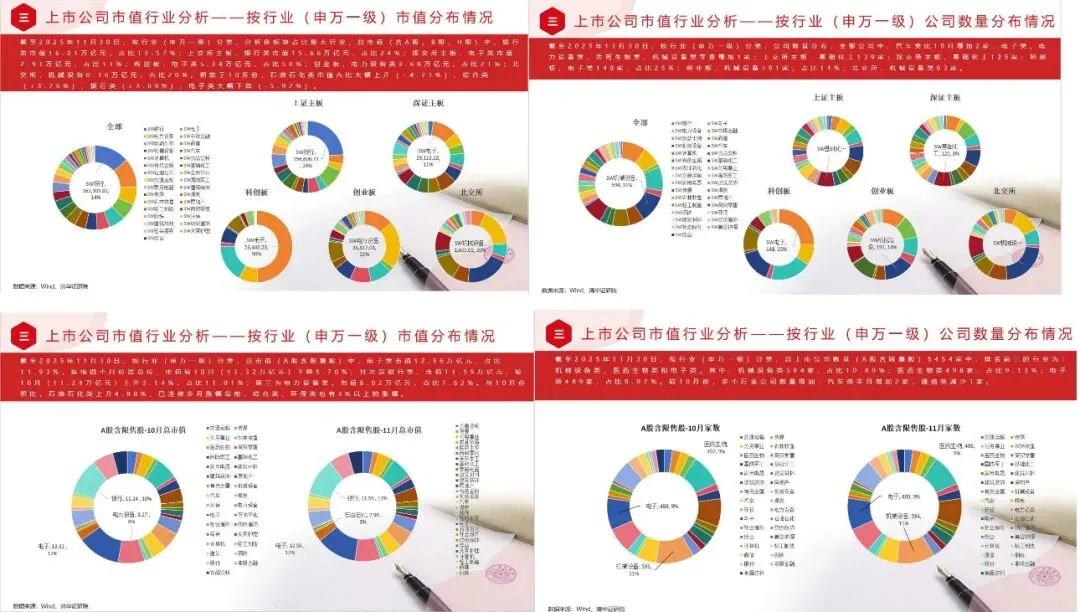 按行业(申万一级)分类,分析各板块占比最大行业,总市值(含A股、B股、H股)中,银行类市值15.71万亿元,占比12.77%;上交所主板,银行类市值15.17万亿元,占比23%;深交所主板,电子类市值3.02万亿元,占比11%;科创板,电子类6.14万亿元,占比52%;创业板,电力设备类3.65万亿元,占比21%;北交所,机械设备0.17万亿元,占比20%。相较于11月份,有色金属类市值占比大幅上升(+17.46%)、国防军工类(+15.50%)、电子类(+9.43%),食品饮料类大幅下降(-5.28%)。按行业(申万一级)分类,公司数量分布,全部公司中,电子类比11月增加5家,基础化工类增加4家;上交所主板,基础化工139家;深交所主板,基础化工128家;科创板,电子类153家,占比26%;创业板,机械设备191家,占比14%;北交所,机械设备类64家。按行业(申万一级)分类,总市值(A股含限售股)中,电子类市值13.77万亿元,占比12.66%,连续五个月位居首位,市值较11月(12.56万亿元)上升9.57%;其次是银行类,市值11.27万亿元,较11月(11.59万亿元)下降2.81%,占比10.36%;第三为电力设备类,市值8.12万亿元,占比7.47%。与11月份相比,有色金属类上升17.15%,国防军工类上升15.62%、通信类也有10%以上的涨幅。按行业(申万一级)分类,总上市公司数量(A股含限售股)5470家中,排名前三的行业为:机械设备类、医药生物类和电子类。其中,机械设备类595家,占比10.88%;医药生物类499家,占比9.12%;电子类494家,占比9.03%。较11月份,多个行业公司数量增加较多,电子类本月增加5家,基础化工类增加4家。按行业(申万一级)市盈率情况,国防军工、有色金属、综合等行业的市盈率上升明显,本月国防军工类市盈率上升17.77%,有色金属类上升14.30%,综合类上升13.55%;本月部分行业下降幅度较大,其中,食品饮料下降5.27%、房地产下降4.37%、医药生物下降3.98%;家用电器、银行、建筑装饰、非银金融类市盈率较低,为15以下。与去年同比之下,社会服务类、房地产类和有色金属类为上升幅度最大的三个行业,社会服务类同比上升96.83%,房地产同比上升58.36%,有色金属类同比上升55.01%。按行业(申万一级)市净率情况,本月较11月份大部分行业都有所上升。国防军工、有色金属、通信等行业提升比例相对较大,其中,国防军工类涨幅达17.74%;食品饮料类、医药生物类、煤炭类降幅较大,其中,食品饮料类跌幅达5.25%。房地产、建筑装饰、银行市净率较低,为1以下。通信类同比上升76.90%,有色金属类同比上升76.38%,食品饮料类同比下降14.25%。