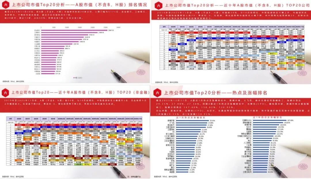 按总市值(包含A、B、H股)排名的前20家公司,入围门槛为6417亿,较11月提高95亿元。工商银行、农业银行、建设银行、中国石油、贵州茅台排名靠前,其中总市值超万亿公司合计12家。整体前20家中,国企14家,民企3家,公众企业3家。2021年至2025年12月份总市值(包含A、B、H股)前20名,与11月份相比,中国石油、紫金矿业、中际旭创均达历史最高。中国石油、紫金矿业均上升两名,中际旭创首次进入前20。2021年至2025年12月份总市值(包含A、B、H股)前20名,除去金融相关行业,石油石化、电子等行业公司较多。较11月份,中国石油排名首次位列第一,中际旭创、新易盛、洛阳钼业排名上升明显,洛阳钼业首次排名挤入前20名。恒瑞医药、五粮液退出前20。按A股(不含B、H股)市值排名的前20家公司,入围门槛为5216亿,农业银行、工商银行、贵州茅台、中国石油排名靠前,超过万亿市值的共计7家。前20家中,国企11家,占比55%;民营企业5家,公众企业4家。2021年至2025年12月份,A股(不含B、H股)市值前20名,与11月份相比,中际旭创排名继续大幅上升,市值创历史新高。紫金矿业排名创新高;长江电力、中国神华、邮储银行、中国电信等市值排名大幅下降,其中中国电信掉出前20。反映出近期算力基础设施、高速光模块等硬科技领域与有色金属等资源类板块走强。2021年至2025年12月份,A股(不含B、H股)前20名,与11月份相比,中际旭创排名继续提升2名,且连续三个月上升幅度较大。新易盛上升4名,长江电力下降3名,洛阳钼业首次进入前20。 A股近1月热点及涨幅排名中,玻璃纤维、大飞机、南水北调位列涨幅前三,涨幅分别达 29.35%、27.88%、27.38%。同期A股近1年热点及涨幅排名中,光模块(CPO)、键电毫米波、玻璃纤维占据涨幅前三,涨幅分别高达 167.40%、150.82%、130.92%。对比来看:玻璃纤维、光模块(CPO)、光芯片、光通信等板块同时跻身两个榜单;其中玻璃纤维在双榜中均表现亮眼,近1月涨幅29.35%,近1年涨幅130.92%。