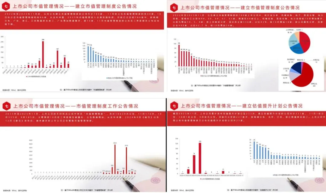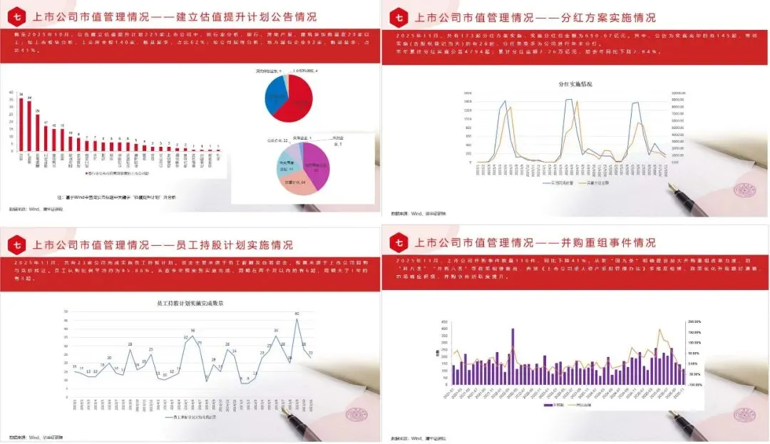 2022年至2025年12月份,公司公告建立市值管理制度的公司共计835家,12月份公告市值管理制度的有68家,公司数量较11月增加28家,从全年来看,2025年市值管理进入全面实践阶段。目前已公告的835家中,按省域分布,广东、浙江、江苏数量排名前三,浙江增加数量最多,是6家,市值管理制度公告数量全年波动上升。2022年至2025年12月,公告建立市值管理制度的835家上市公司中,按行业分析,机械设备、医药生物、基础化工、电子、电力设备,分别为106、72、71、69、67家,数量在50家以上,机械设备、基础化工较11月增加最多,分别为增加10、6家;按上市板块分析,深交所主板355家,占比43%,较11月增加19家;按公司属性分析,民营企业512家,占比61%,较11月增加23家。2015年至2025年12月,上市公司的不同形式公告中涉及“市值管理制度”,合计10856次公告,12月217次,较11月增加39次,主要原因是三季度报告披露后,公告数量有所增加。从全年来看,2024年9月《指引》以及12月《意见》发布后,越来越多的上市公司正在筹备市值管理制度。截至2025年12月,上市公司相继发布估值提升计划公告233次,建立估值提升计划的公司共计225家,12月份无公告,11月份1次公告。目前已公告的225家中,按省域分布,北京、江苏、浙江数量排名前三。上市公司中既公布市值管理制度又公布估值提升计划的公司共25家。截至2025年12月,公告建立估值提升计划225家上市公司中,按行业分析,银行、房地产、建筑装饰数量在20家以上;按上市板块分析,上交所主板140家,数量最多,占比62%;按公司属性分析,地方国有企业92家,数量最多,占比41%。