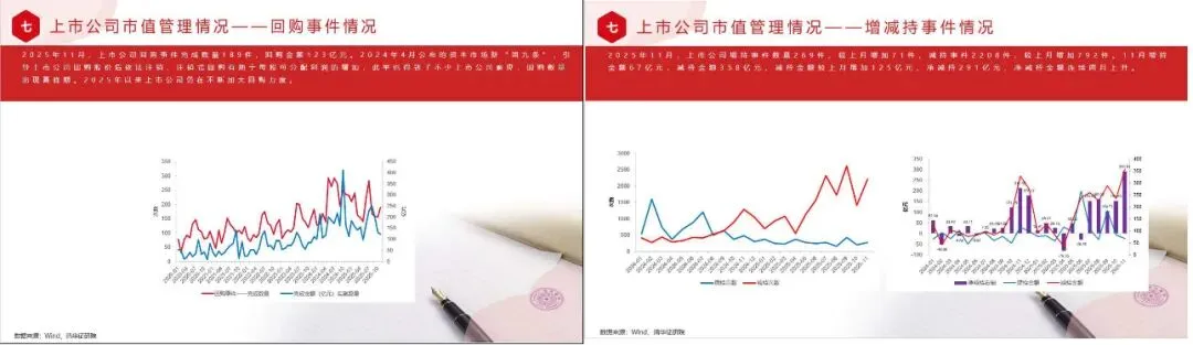 根据wind内地股票专题统计,2025年12月,共有147起分红方案实施公告,实施分红总金额为2704.74亿元。其中,公告为实施完毕的有120起,等待实施(含股权登记当天)的有27起,分红类型多为公司进行年中分红与特殊分红。本年累计分红实施公告4941起;累计分红金额2.53万亿元,较去年同比增加1.19%。2025年12月,共有20家公司完成实施员工持股计划。资金主要来源于员工薪酬及自筹资金,股票来源于上市公司回购。员工认购比例平均约为76.79%,高管认购比例平均约为17.45%。从董事会预案到实施完成,周期在两个月以内的有5起,周期大于1年的有2起。2025年12月,共有25家公司完成股权激励的实施。其中民营企业18家,国有企业3家,外资企业3家,公众企业1家。激励标的物主要为第二类限制性股票与第一类限制性股票。激励方式主要为上市公司定向发行股票及上市公司提取激励基金买入流通股。主要行业为硬件设备4家,食品饮料类3家等。2025年12月,上市公司并购事件数量192件,同比下降19.3%。从新“国九条”明确提出加大并购重组改革力度,到“科八条”“并购六条”等政策相继推出,再到《上市公司重大资产重组管理办法》多维度松绑,政策优化升级路径清晰,市场响应积极,并购事件活跃度提升。2025年12月,上市公司回购事件完成数量170件,回购金额231亿元。自2024年4月资本市场新“国九条”,引导上市公司回购股份后依法注销,注销式回购有助于每股可分配利润的增加,此举也得到了不少上市公司响应,回购数量出现高峰期,2025年以来上市公司仍在不断加大回购力度。2025年12月,上市公司增持事件数量249件,较上月减少31件,减持事件2464件,较上月增加102件。12月增持金额1亿元,减持金额324亿元,减持金额较上月增加35亿元,净减持195亿元。
