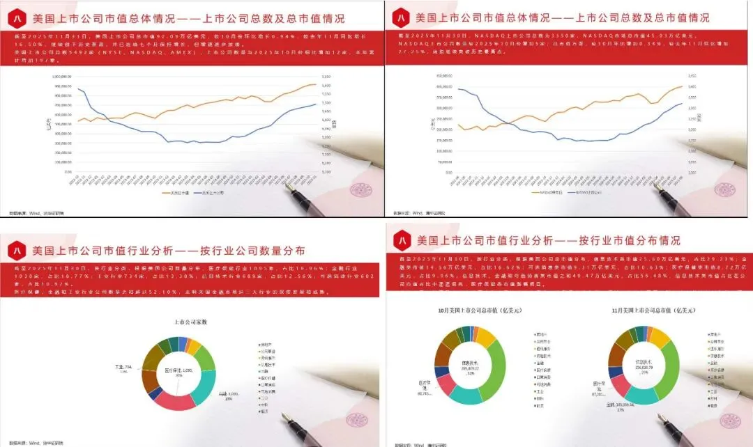 美国上市公司总市值92.77万亿美元,较11月份环比增长0.75%,较去年12月同比增长20.66%,继续创下历史新高,并已连续八个月保持增长,但增速逐步放缓。美国上市公司总数5487家(NYSE、NASDAQ、AMEX),上市公司数量与2025年11月份相比减少5家,本年累计增加181家。NASDAQ上市公司总数为3351家,NASDAQ市场总市值46.08万亿美元。NASDAQ上市公司数量较2025年11月份增加1家;总市值方面,较11月环比增加2.33%,较去年12月同比增加28.81%,纳指继续突破历史最高点。按行业分类,根据美国公司数量分布,医疗保健行业1090家,占比19.87%;金融行业1046家,占比19.07%;工业行业733家,占比13.36%;信息技术行业685家,占比12.49%;可选消费行业598家,占比10.90%。医疗保健、金融和工业行业公司数量之和超过52.31%,表明美国金融市场这三大行业的深度发展和成熟。按行业分类,根据美国公司总市值分布,信息技术类市值25.80万亿美元,占比29.20%;金融类市值15.05万亿美元,占比17.07%;可选消费类市值9.38万亿美元,占比10.62%;医疗保健类市值8.73万亿美元,占比9.88%。信息技术、金融和可选消费类市值之和50.23万亿美元,占比56.85%,信息技术类市值占比在公司市值占比中遥遥领先。整体来看,美国股市的市值高度集中于这些关键行业,特别是科技和消费领域,这也体现了全球经济中科技创新和消费驱动型增长的趋势。