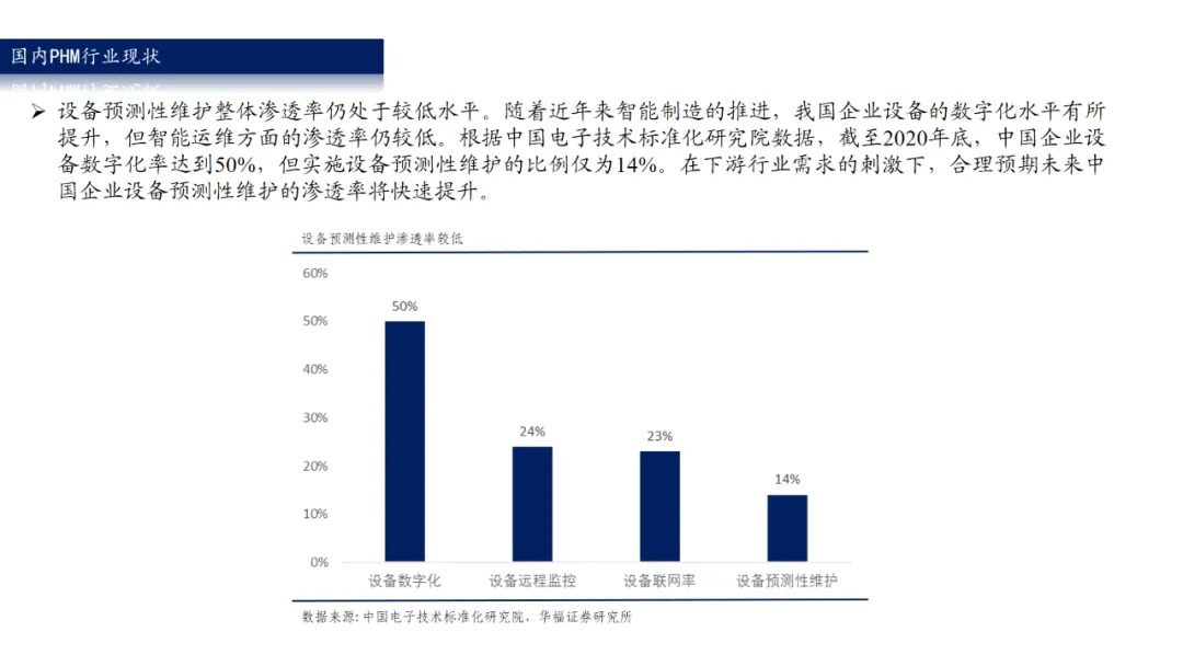 随着我国制造业转型升级战略推进,相关部门不断推出制造业转型相关政策,推动制造业综合实力持续增强。同时,国家也发力推动国有企业数字化智能化转型升级,加速信息化工业化融合,打造行业数字化转型示范样板。在制造业转型升级和国有企业数字化的战略背景下,越来越多的工业企业将要推动数字化、自动化、智能化改造,设备PHM系统可以推动设备运维向智能化新模式转变,下游需求进一步提高,迎来发展机遇。