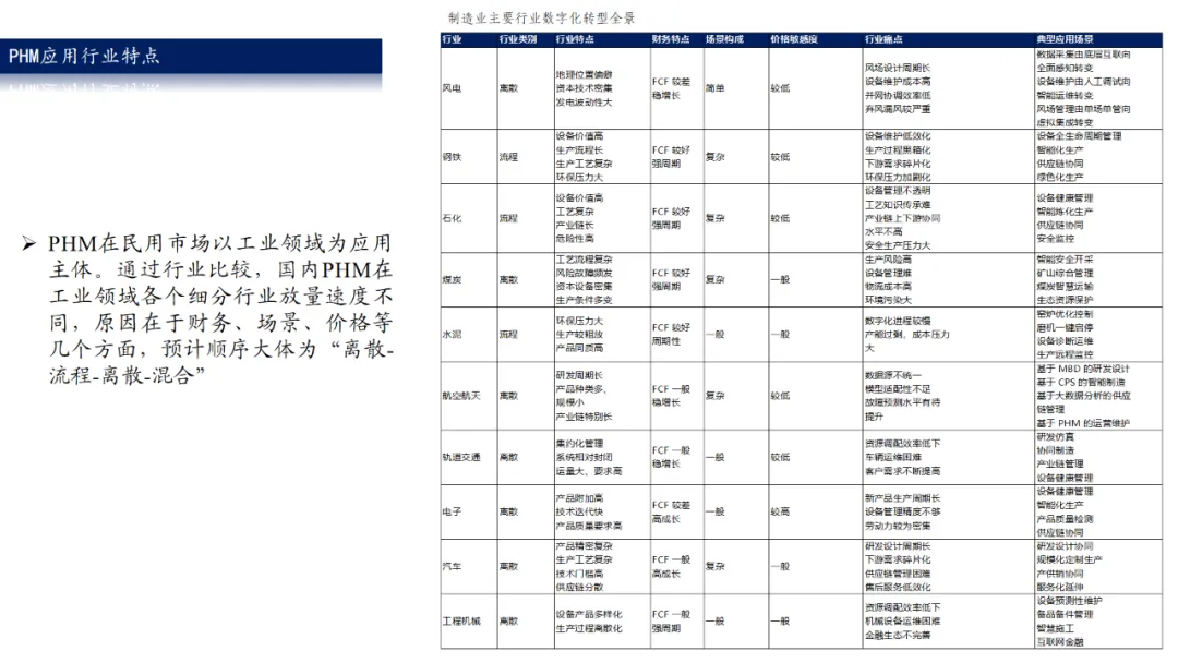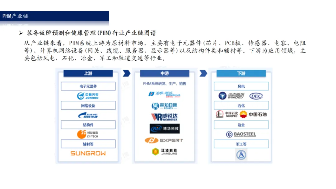 PHM系统下游分布广泛,主要包括风电、石化、冶金、军工和轨交等。这些行业对PHM系统的需求强烈,而且不断更新升级,从而为PHM系统提供了巨大的增值空间。