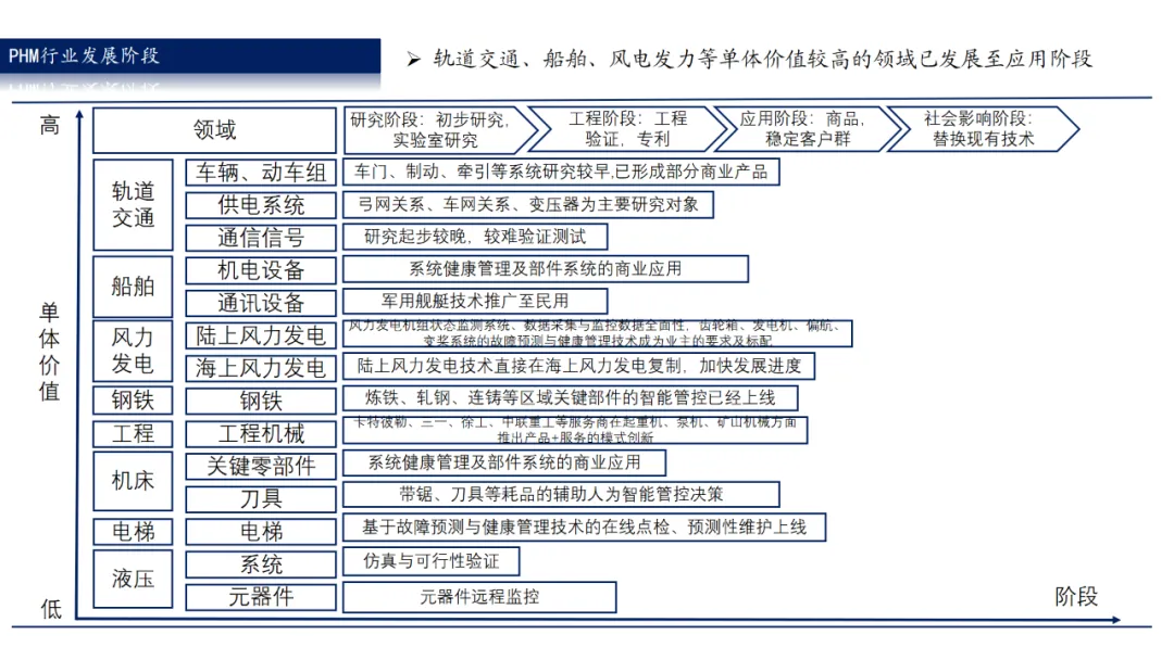 我国PHM技术由军用向民用领域逐步渗透,单体价值高的民用领域已发展至应用阶段。相比军用领域设备,民用领域设备出勤频次更高、后勤保障时长更短,其单体价值、投入成本的能力相比军用设备仍存在差距。对于轨道交通、船舶、工程机械、钢铁等行业而言,随着工程师数字化能力、算法机理知识理解能力的提升,PHM技术在民用领域逐步进入广泛应用阶段。