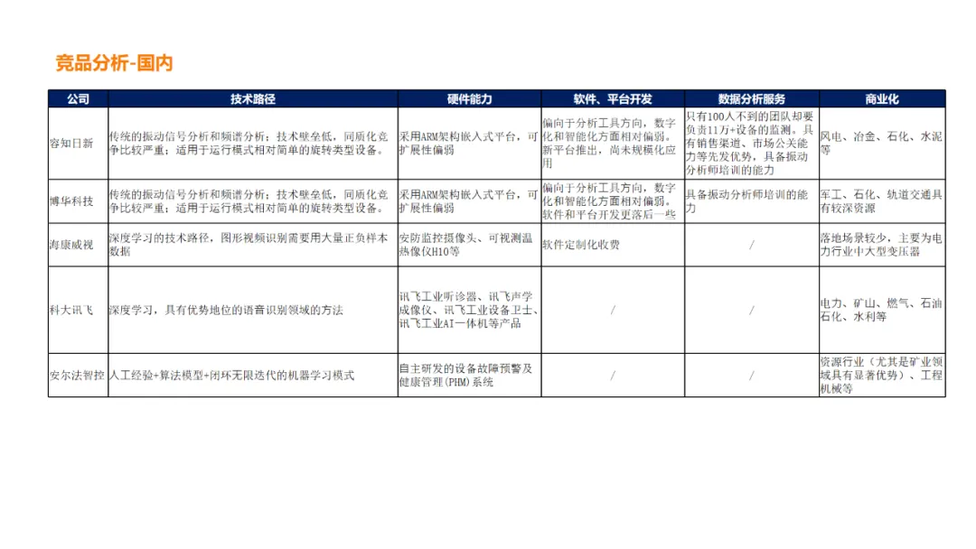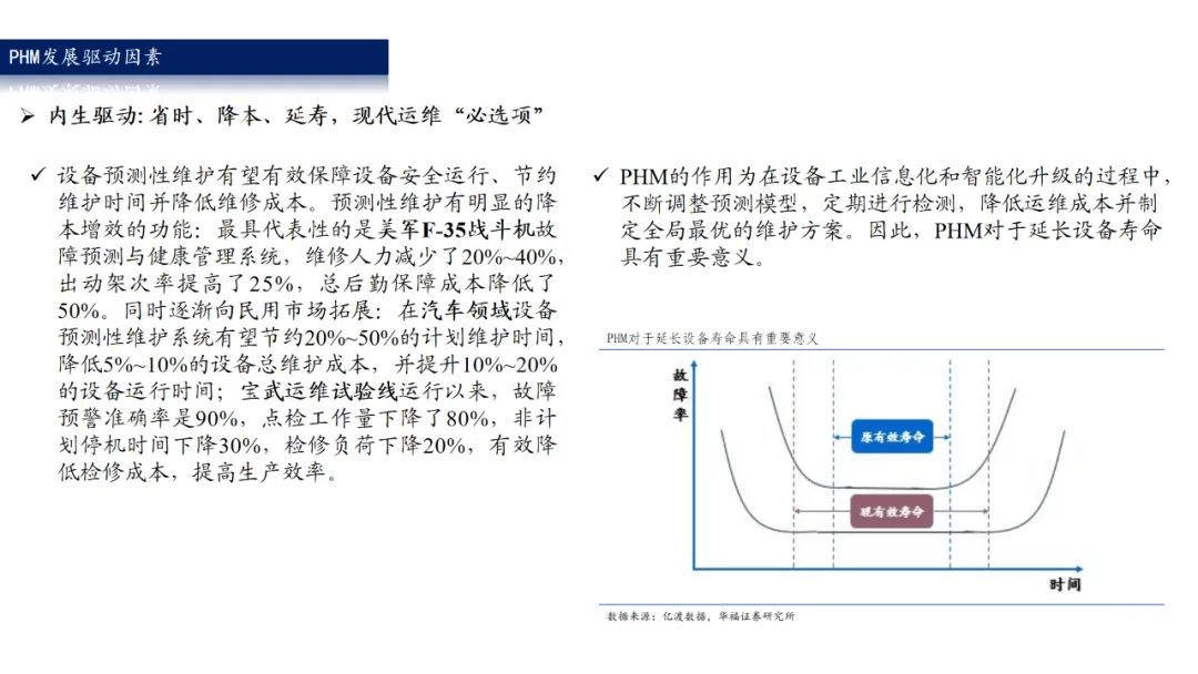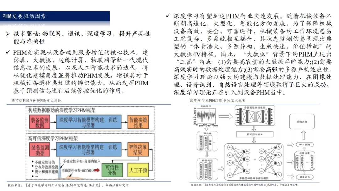 PHM行业国内步入成长期,深耕厂商有望收获双击。在2010年左右,国内PHM行业整体处于导入期水平,产品较为落后,“疗效”远远达不到“药品”的等级,只能作为一种“保健品”。“十三五”期间,PHM准确率不断上升,漏报和误报率下降,市场空间和入局玩家数量都在快速增长,市场较为分散。“十四五”期间,政策、安全、效益、技术共同驱动,PHM愈发精准化、智能化,将从设备的“保健品”转为“必备药”。钢铁、石化、煤炭等头部客户示范效应显著,强力催化配置需求觉醒。行业已经度过政策驱动为主的发展阶段,将步入成本控制、产品技术、需求景气等驱动为主的成长阶段,深耕厂商有望收获业绩+估值双击。
