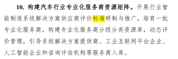 “构建汽车行业专业化服务商资源矩阵”该要点明确指出“开展行业智能制造系统解决方案供应商评价标准研制与推广”,它标志着政策着力点从单纯补贴鼓励企业转型,向前延伸至供给侧能力的系统构建与市场环境的规范培育。