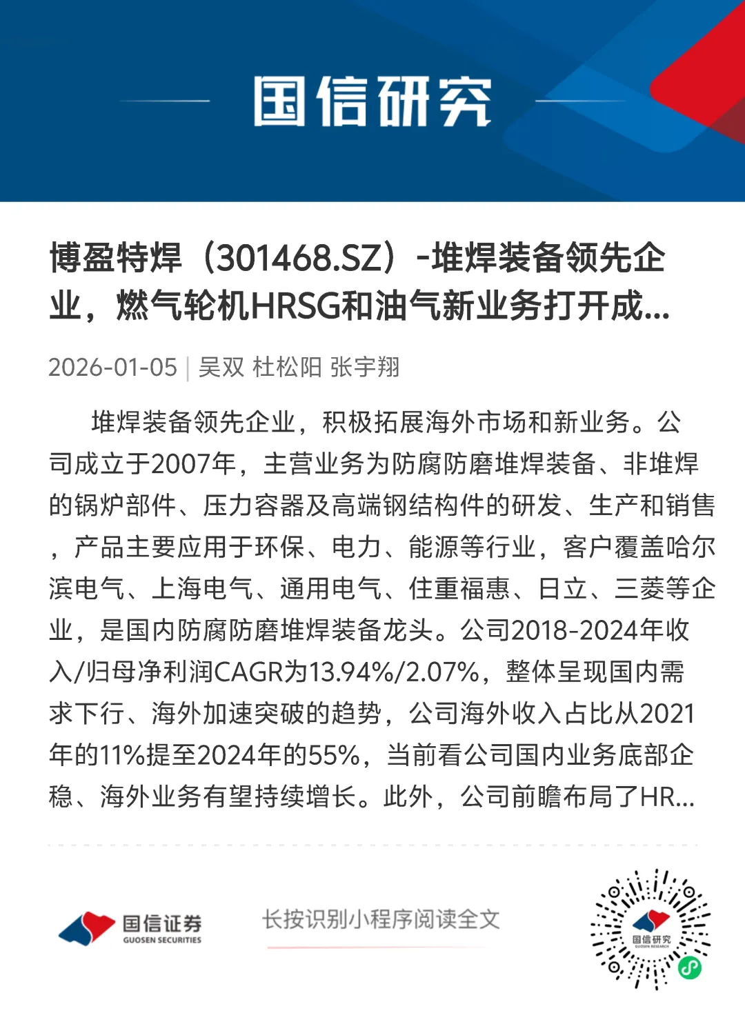 报告完整内容详见2026年1月5日发布的博盈特焊深度报告《堆焊装备领先企业,燃气轮机HRSG和油气新业务打开成长空间》