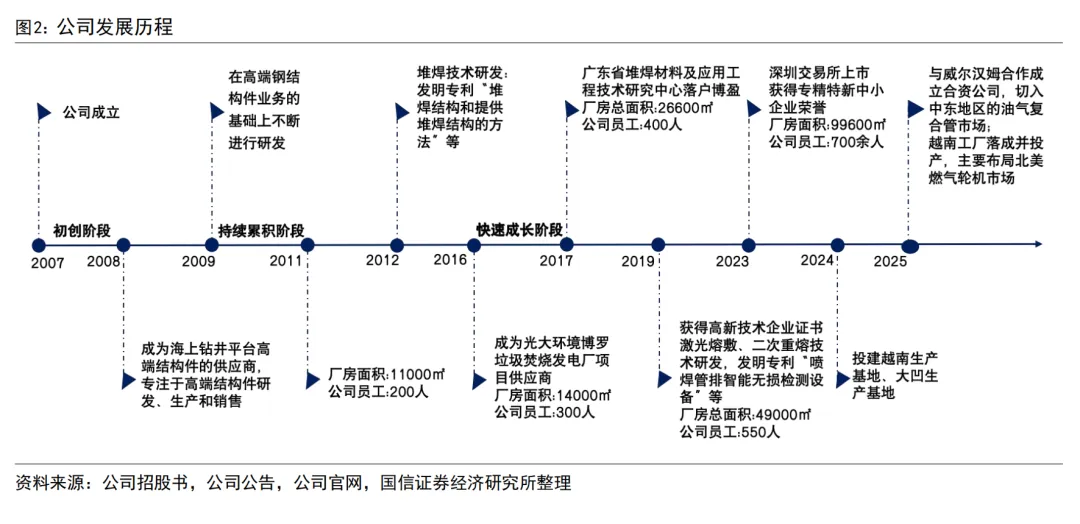 1)2007年-2020年:深耕防腐防磨推焊装备主业,精准卡位国内垃圾焚烧发电行业高景气赛道,快速成长为行业领先制造商。公司成立于2007年,初期聚焦高端结构件研发生产,并持续迭代研发能力,成功研发出先进的堆焊技术。在此阶段,国内垃圾焚烧发电行业步入快速发展阶段,公司积极把握市场机遇,重点布局垃圾焚烧发电市场,2016年与光大环境博罗垃圾焚烧发电厂合作,实现国内首次防腐防磨堆焊装备在中温次高压垃圾焚烧余热回收锅炉的应用突破。凭借核心技术、先进制造工艺以及稳定产品质量,公司在垃圾焚烧发电市场渗透率逐步提升,快速成长为国内主要节能环保运营企业防腐防磨堆焊装备的核心供应商,并于2019年获得高新技术企业证书。2)2021年-2024年:国内需求下滑的背景下,公司积极开拓海外市场。公司于2023年在深圳交易所上市。随着国内垃圾焚烧发电行业新建项目投放放缓、存量项目改造需求收缩,行业景气承压,公司国内业务进入调整期。全球垃圾处理需求凸显,海外垃圾焚烧发电市场呈现双轮驱动格局,发展中国家新增项目需求旺盛,欧美、日本等发达国家和地区存量项目升级改造需求迫切,行业成长空间广阔。公司前瞻性布局海外市场,2021至2022年,公司与全球垃圾焚烧发电巨头日立(HZI)合作,参与全球规模最大的阿联酋迪拜垃圾焚烧发电项目,提供整体锅炉炉膛,实现海外标杆项目突破。公司同时积极参与HZI澳大利亚Rockingham项目、SBE芬兰Vantaa项目、西子洁能英国Lostock项目等重点项目,业务覆盖美国、加拿大、德国、日本、泰国等多个国家和地区,充分受益于海外市场需求高增长。3)2025年至今:海外堆焊业务景气度向好,拓展HRSG和油气复合管市场业务,海外布局进一步加强。海外垃圾焚烧行业发展态势良好,公司积极布局海外业务,未来海外堆焊板块收入利润有望逐步提升。同时,公司积极开拓海外市场,2025年越南生产基地一期成功落成并投产,拓展余热锅炉(HRSG)新产品以卡位北美市场,二期工程已启动建设,预计2026年二季度投产,同时在越南追加2.75亿元投资,有望进一步拓展当地产能;同时与威尔汉姆成立合资公司,积极切入中东地区的油气复合管市场,海外收入增长潜力持续释放,为长期业绩增长奠定坚实基础。