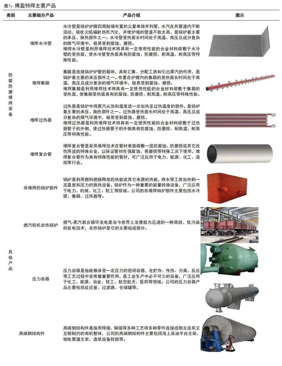 公司的主要产品为防腐防磨堆焊装备,核心围绕节能环保、电力、能源、化工等工业领域需求。公司专注特种焊接技术的研发,主要产品防腐防磨堆焊装备,2024年占营业收入比重约81%,可用于节能环保、电力、能源、化工、冶金等多个重要工业领域,其中2024年垃圾焚烧发电行业占营业收入比重约68.46%。同时,公司利用现有的技术和生产能力,还生产和销售非堆焊的锅炉部件、压力容器、高端钢结构件等其他产品,并逐步向下游更多领域延伸,包括燃煤发电、生物质发电等其他应用领域,有效促进了下游产业实现节能降耗、减排增效和转型升级。
