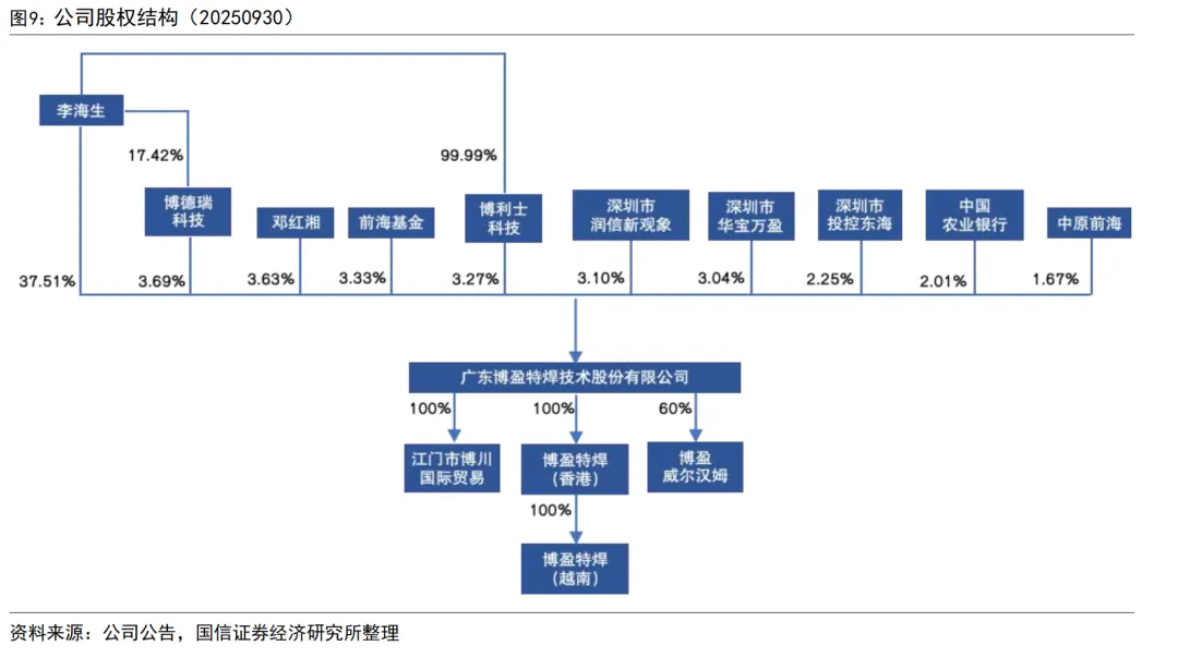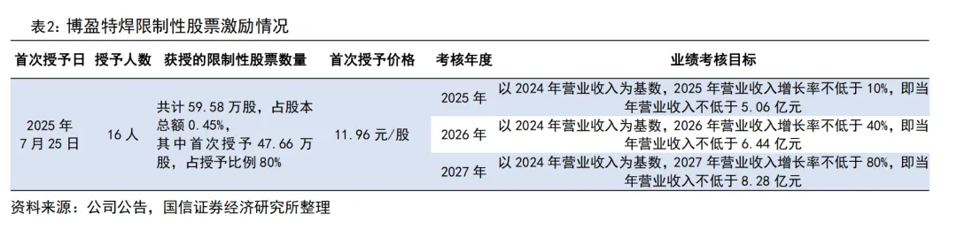 公司股权结构集中,董事长李海生为公司实控人,合计持股比例44.47%。截至2025年11月26日,公司第一大股东李海生直接持股比例37.51%,并通过员工持股平台博德瑞科技、博利士科技分别间接持股3.69%、3.27%,合计控制公司44.47%的股份。公司管理团队深耕行业多年,研发能力与管理经验深厚。公司董事长李海生致力于焊接技术研发、特种设备制造相关的工作,2007年创立公司时已沉淀10余年焊接技术开发及管理经验,至今已深耕行业20余年。高管中刘渭林、陈必能、段君杰均具有丰富的行业从业经验,三人与董事长李海生均曾任职于福斯特惠勒动力机械有限公司,其中刘渭林于2018年3月加入公司,曾任技术部经理,现任副总经理;陈必能于2017年12月加入公司,现任副总经理、市场部总监;段君杰于2011年5月加入公司,现任总工程师,在粉末喷焊重熔、MIG堆焊技术、多层异种金属承压无缝复合管制造技术等领域掌握核心工艺及关键技术。公司实施股权激励计划,股权激励承诺2025-2027年收入CAGR不低于22%。公司于2025年7月25日发布《关于向激励对象首次授予限制性股票的公告》,授予激励对象的限制性股票数量为59.58万股,占股本总额0.45%,其中首次授予47.66万股,占授予比例80%,激励对象包括董事、高级管理人员、核心技术和业务人员在内的16名员工,授予价格为11.96元/股,考核目标为2025年-2027年营收较2024年营收同比分别不低于10%/40%/80%,三年营收分别不低于5.06/6.44/8.28亿元,2024-2027年收入CAGR不低于21.64%。堆焊:应对腐蚀磨损的高壁垒方案,积极布局景气度向好的海外市场