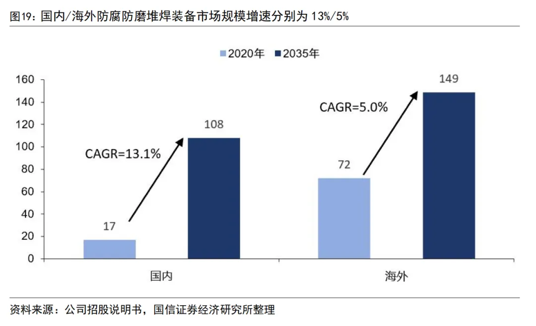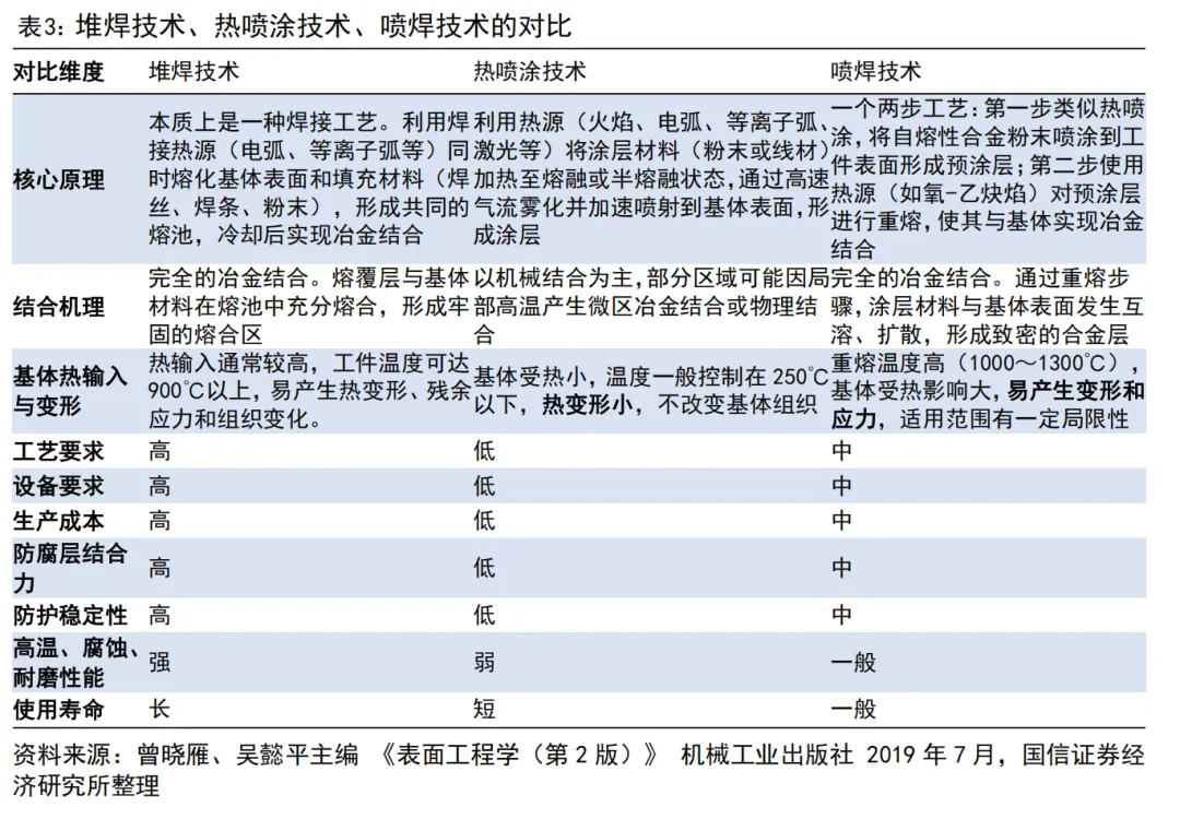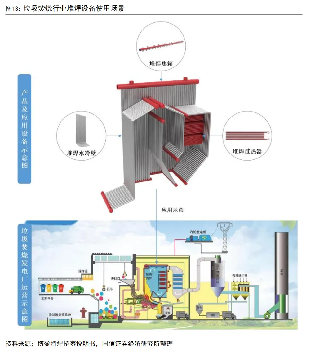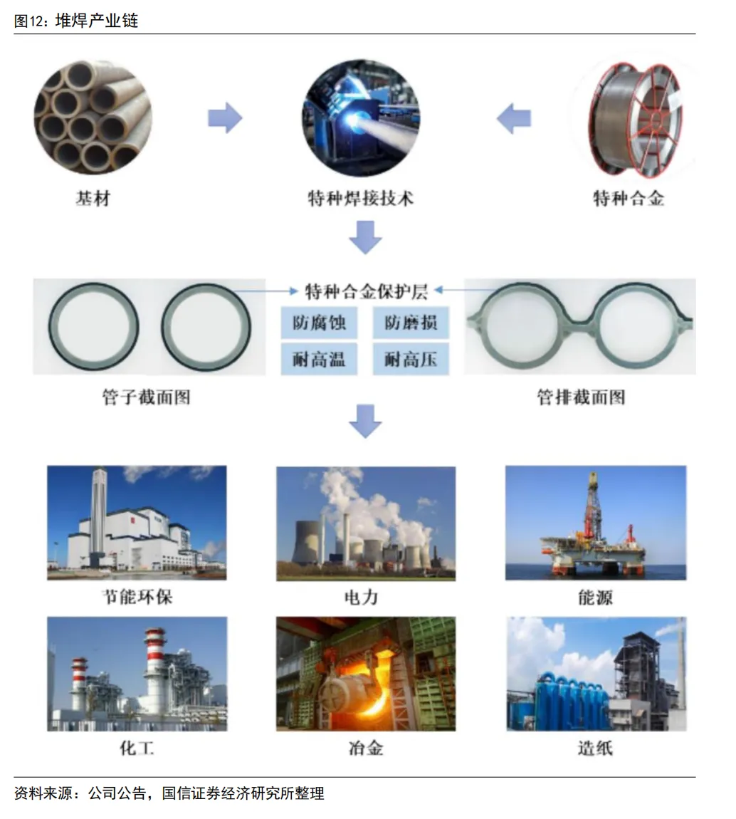 工业防腐防磨有助于减少设备的腐蚀磨损,提升使用寿命和经济性。在工业设备的生产过程中,工业防腐防磨行业是通过使用表面工程技术对工业设备或工件表面进行处理,使其表面成分或结构发生改变,从而提升其耐腐蚀、耐磨损的性能。防腐防磨相关的技术和产品能有效解决节能环保、电力、能源、化工、冶金、造纸等行业设备的腐蚀、磨损问题。和其他表面涂镀技术相比,堆焊技术在防腐层结合力、防护稳定性、使用寿命方面存在明显优势。可以实现工业设备在强腐蚀、易磨损、高温、高压等复杂环境下的安全、稳定、长周期、高效率运行,可以降低设备检修、更换损失及停工损失。随着技术的进步、产能的提升和生产效率的提高,堆焊技术已经在垃圾焚烧发电领域实现了产业化应用,并在生物质发电、燃煤发电、化工、能源、冶金、造纸等领域实现了良好应用,逐渐成为强腐蚀、易磨损、高温、高压等复杂环境下工业设备防腐防磨的主流技术路线。堆焊设备主要用于垃圾焚烧发电、燃煤发电等领域。堆焊技术主要应用于能源、电力、化工、冶金及造纸等重工业领域:在管道与管排系统中,堆焊层有效抵御介质腐蚀与机械磨损;在电力设备中修复关键部件以保障运行安全;在能源开采、化工反应、冶金轧制及造纸装备中,堆焊技术通过提升核心部件的耐久性,直接支撑生产系统的稳定、高效与低碳运行,成为工业设备延寿、降耗、提效的关键表面工程技术手段。生活垃圾在高温焚烧处置时,会产生含有大量氯化物、碱金属盐的高温烟气,容易对垃圾焚烧余热回收锅炉受热面造成严重腐蚀。同时,由于烟气流速较大,烟气中的颗粒会对锅炉受热面造成冲刷磨损。随着生活垃圾的热值不断提高,垃圾焚烧所释放的腐蚀性物质增加,锅炉的腐蚀、磨损问题也在加剧。公司的防腐防磨堆焊装备能有效提升垃圾焚烧余热回收锅炉在复杂环境下的防腐防磨性能,延长其使用寿命,降低设备检修、更换损失及停工损失,提高了垃圾焚烧发电效率,进而有助于提高垃圾焚烧发电运营企业的经济效益。2)燃煤发电行业: