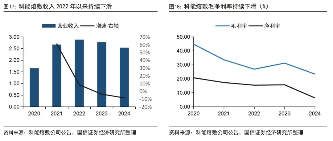 煤炭在高温燃烧时,会产生含有氯化物、硫化物、硫酸盐的高温烟气,容易对燃煤发电锅炉管壁造成腐蚀;由于烟气流速较大,烟气中的颗粒会对锅炉管壁造成冲刷磨损。同时随着环保要求提升,燃煤发电锅炉需要进行低氮燃烧改造以降低氮氧化物。公司的防腐防磨堆焊装备能有效提升燃煤发电锅炉的防腐防磨性能,延长其使用寿命,降低设备检修、更换损失及停工损失。同时,公司的防腐防磨堆焊装备有助于燃煤发电企业进行低氮燃烧改造。我国人均垃圾产量明显低于全球平均水平。据经济合作与发展组织数据,2023年中国人均垃圾年产量179千克,平均每人每天生产垃圾0.5千克,明显低于全球平均水平(288千克/年),较美、德等发达国家有较大差距。差异主要因为:1)发达国家消费水平高、包装用品使用多、食物浪费现象相对普遍,导致垃圾产生量较大;2)近年来中国积极推进垃圾分类政策,减少了进入垃圾处理系统的总量;3)中国部分地区人口密度较低、农村地区占比大,居民生活以自给自足为主,垃圾产生量相对较少。垃圾清运量增速放缓,行业处于筑底阶段。随着城镇化率提升和经济水平提高,2020年前我国的生活垃圾清运量快速提升,增速长期保持在6%以上。2020年以来,行业从过去十年的“跑马圈地、高速扩张”的增量发展模式,转向“精耕细作、存量优化”的高质量发展阶段,我国人均生活垃圾清运量增速在0%-4%附近,增速明显下滑。国内垃圾焚烧需求持续下滑,市场竞争加剧。国内垃圾焚烧发电行业正从过去十年的高速扩张期,进入一个需求增长放缓、产能局部过剩、竞争激烈的周期底部。国内堆焊行业中,博盈特焊和科能熔敷的市场份额较高。2021年以来博盈特焊收入和毛利率有所下滑,科能熔敷的收入和盈利能力也逐年下滑:科能熔敷的收入从2022年的最高点2.89亿元下降至2024年的2.54亿元,毛利率/净利率从2020年的高点44.76%/20.72%下降至2024年的23.36%/6.30%,分别同比下降21.40/14.42个百分点。全球垃圾焚烧市场空间约350亿美元,未来十年增速6.1%。和国内不同,当前垃圾焚烧行业的海外市场,特别是以东南亚、中亚为代表的“一带一路”沿线国家,正处于一个需求明确、政策支持、市场空间广阔的高景气度扩张期。根据Data Horizon Research数据,在全球废物产生量增加、能源安全问题日益严重以及促进可持续废物管理解决方案的严格环境法规的推动下,预计2025年至2033年“垃圾发电市场”将以6.1%的复合年增长率增长。全球市场规模将从2025年的348亿美元扩至2033年的623亿美元。垃圾焚烧发电领域的防腐防磨堆焊装备市场空间超150亿元。参考博盈特焊招股书,预计2020年垃圾焚烧发电领域防腐防磨堆焊装备的国内存量市场仅17亿元,2035年有望增长至108亿元,期间CAGR13.1%,海外存量市场72亿元,是国内市场空间的4-5倍,2035年有望增长至149亿元,期间CAGR=5.0%,其中新兴国家的垃圾焚烧发电行业有望获得更快增速。公司积极突破技术壁垒,已建立较深的护城河。公司取得了国内A级锅炉制造及安装许可证,美国ASME锅炉及压力容器制造许可证,欧盟EN3834-2焊接体系认证等认证。工业防腐防磨工艺的技术壁垒主要体现在堆焊层的均匀性、稀释率、厚度。公司自主研发并掌握了涵盖材料、工艺、设备等方面的关键核心技术,较好地解决了大面积堆焊中存在的技术难题,实现了防磨堆焊装备的规模化生产与产业化应用:1)材料方面,公司加强对丝材、粉材等多种形态合金材料的应用研究,提高合金材料的防腐防磨性能。2)工艺方面,公司在巩固数字脉冲MIG堆焊领域优势技术的基础上,不断开发和储备行业先进技术,先后开发并掌握了激光堆焊、二次重熔等领域的核心技术。3)设备方面,持续优化多功能数控智能设备系统,积极开发新型自动化设备,不断提升生产自动化水平。4)产业方面,公司拥有广东省堆焊材料及应用工程技术研究中心,依托研究中心的平台优势、人才与资源聚集优势,坚持走自主创新的发展道路。公司积极探索开发新材料、新工艺、新技术和新设备,形成了较丰富的研发成果,积累了较充足的生产制造经验,实现了人才储备、专利储备和技术储备。公司累计生产完成的防腐防磨堆焊业绩处于行业领先地位。根据生态环境部的数据,截至2021年12月底,我国已投入运营的垃圾焚烧发电厂有691座,公司为其中129座提供了防腐防磨堆焊装备,占比为18.67%。根据生态环境部的数据,2018年至2021年我国新投入运营的垃圾焚烧发电厂有410座,公司为其中95座提供了防腐防磨堆焊装备,占比为23.17%。考虑到防腐防磨堆焊在垃圾焚烧发电领域应用的渗透率仍然较低,所以公司防腐防磨堆焊装备的实际市场占有率高于上述数据。海外垃圾焚烧需求旺盛,公司堆焊业务有望迎来转折。2021年前公司堆焊设备收入快速增长,毛利率整体保持在40%以上。受国内垃圾焚烧行业发展趋缓、火电新增项目明显减少等因素影响,公司的堆焊设备收入从2022年开始逐年下滑,毛利率下滑至30%附近。展望未来,东南亚、中亚等地区的垃圾焚烧行业需求旺盛、海外毛利率较高,公司堆焊业务的收入和利润均有望迎来转折点。多措并举,公司积极拓展海外客户。公司以特种焊接技术为核心,向锅炉整体部件制造、高端结构件制造及其他大型装备制造等高价值产品领域拓展,加大对海外垃圾焚烧项目的获取和现役锅炉升级改造市场的开发