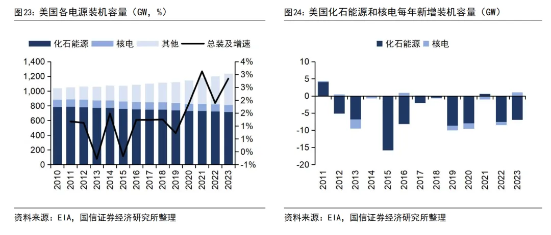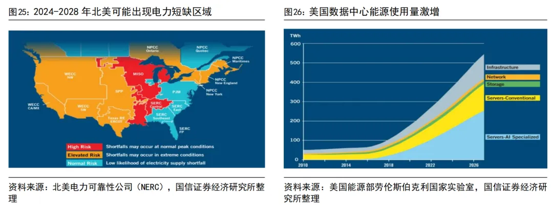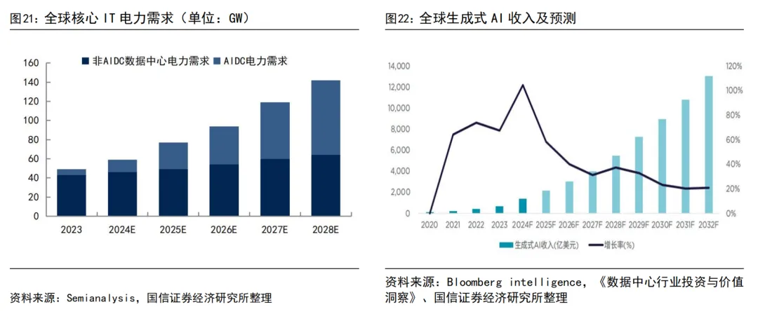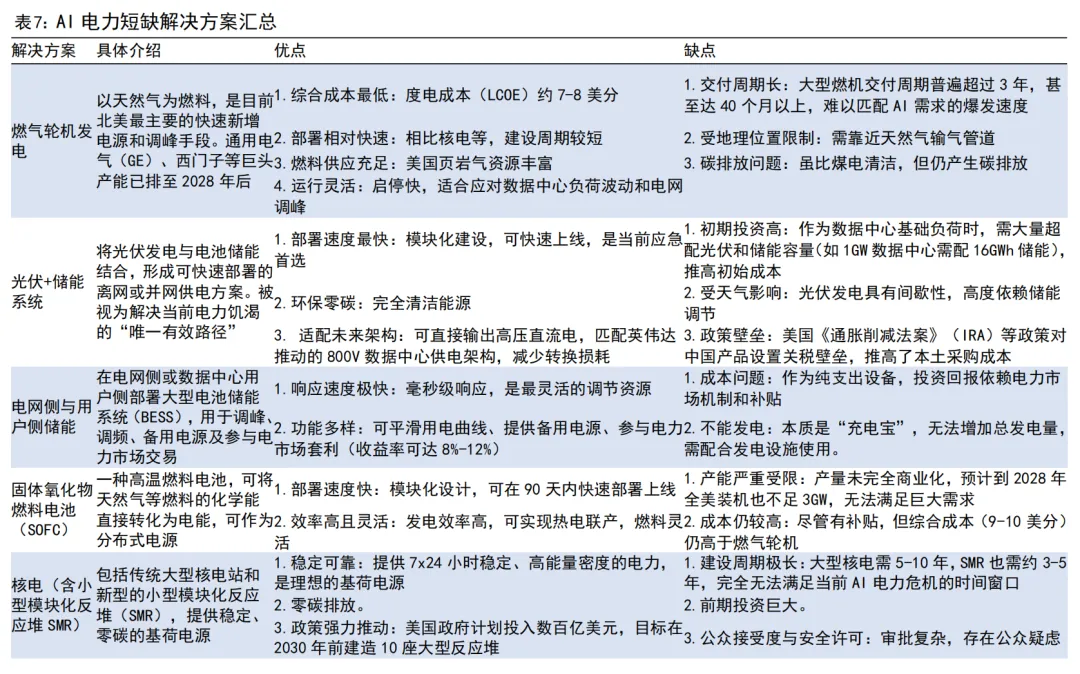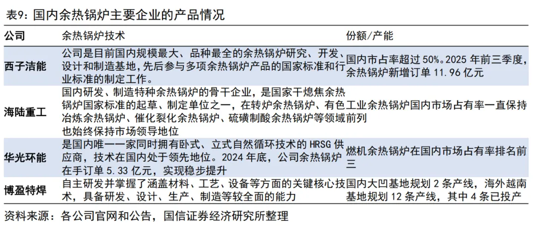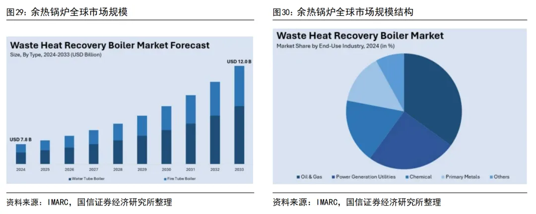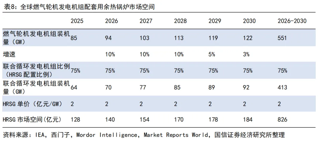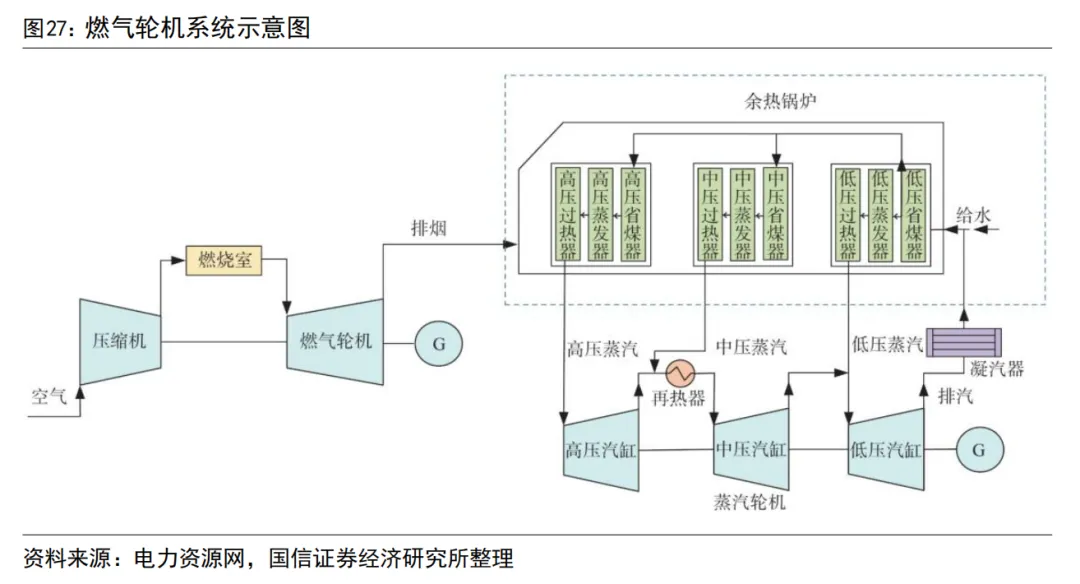 在人工智能、大数据等技术快速迭代的推动下,智算需求成为数据中心发展的重要驱动力。根据中国信息通信研究院测算,截止2023年底全球算力总规模约910EFLOPS(FP32),同比增长40%,核心增长驱动因素是智算中心的大幅扩张。据Semi analysis预测,全球数据中心核心IT电力需求(给服务器供电计算电力消耗,不包括制冷)2023年为49GW,2026年增长至96GW,47GW增量电力需求中新建智算中心需求达40GW(占比85%);据彭博社预测,智算中心基础设施带来的生成式AI收入2024-2032年CAGR超30%。全球积极开启智算中心的资本开支计划。在下游行业需求驱动和顶层政策持续牵引下,2025年起国家层面、互联网企业、电信运营商等企业纷纷开启智算中心的资本开支计划:2025年初以来,中美欧等国家地区纷纷发布千亿美元以上资金规模投向AI基建领域:中国银行万亿元专项金融支持、美国1000亿美元(未来4年内扩展至5000亿美元)、欧盟2000亿欧元、法国1090亿欧元。美国AI爆发带动能够稳定供应的电力需求旺盛,火核装机多年负增长,电力供需矛盾凸显。电力需求方面,在人工智能数据中心集群的快速扩张、美国制造业回流带来的工业用电负荷攀升,以及电动汽车充电桩普及等因素的推动下,美国电网负荷达到新高。电源供给方面,2020年以来美国电源装机增速有所提升,但是仍仅有2%-3%,新增装机速度较慢。分结构来看,新增装机几乎全部由风电、光伏贡献,而风光发电不稳定,难以满足AI数据中心的用电要求;发电稳定可控的化石能源、核电多年负增长。美国燃气轮机的市场需求显著提升。电力基础设施稳定性不足也是电力供需矛盾凸显的原因之一。北美和欧洲部分地区电网老化,维护成本高,极端天气易导致电网故障,影响数据中心的稳定供电。如2021年美国得克萨斯州遭遇暴风雪,电网超负荷运行导致大面积停电,众多数据中心受到影响。北美数据中心主要分布于加州、德州、弗吉尼亚州,随着AIDC快速发展存在区域性缺电的风险(国内拥有特高压输电的基础设施优势);北美电力可靠性委员会(NERC)日前发布《2024年夏季可靠性评估报告》,在夏季极端高温影响下,美国中西部、西南部、东北部等地区面临电力供应不足风险,居民用电或无法得到保障。燃气轮机发电有望成为数据中心缺电的主要解决方案。由AI数据中心爆发式增长引发的电力危机,已成为制约科技与经济发展的核心瓶颈。目前产业内提出的解决方案多样,包括燃气轮机、光储系统、纯储能方案、SOFC、小型核电堆等方案。未来5-10年,较现实的解决方案是“燃气轮机+储能”的组合,有望快速填补电力缺口并保证供电质量。长期来看,随着SMR技术成熟和电网升级项目落地,核电和现代化电网有望成为解决AI电力紧缺的主要解决方案。燃气轮机受益更新需求叠加AI基建增量需求,正持续迎来长景气上行周期。燃机发电以建设周期短、建设成本低等优势成为海外AIDC主用电源首选。燃气轮机受益新兴市场电力需求、更新替换大周期和AI基建增量多因素驱动拐点已至,2024年全球燃机订单量增长同比38%。燃机整机厂收入高增订单饱满指引行业景气度,燃机巨头GEV订单已排至2029年,预计未来5年年均市场规模近400亿美元。余热锅炉:中大型燃气轮机必要配套设备,未来五年需求累计800亿元对能源效率有一定要求的大型、固定式发电场景必须配套余热锅炉(HRSG,Heat Recovery Steam Generator)。燃气轮机是否需要配套余热锅炉,主要取决于其应用场景和对能源利用效率的追求。1)大型发电用燃气轮机(大于50MW):普遍配置,追求极致效率。燃气轮机发电后排出的高温烟气(温度可达500-600℃甚至更高)直接排空会造成巨大的能量浪费。通过余热锅炉回收这部分热量产生蒸汽,驱动蒸汽轮机再次发电,实现了能源的梯级利用。大型集中式电站的燃气轮机,配置余热锅炉形成燃气-蒸汽联合循环(CCPP)是行业标准做法,目的是将发电效率从简单循环的约33%-40%提升至55%-60%甚至更高。2)中型工业与区域供热用燃气轮机(10-50MW):经济性驱动,热电联产是主流。对于功率小于10MW、采用简单循环的燃气轮机,其高温排气(约450℃)若直接排空,会造成热量的巨大浪费和热污染。通过余热锅炉回收热能,产生工业用蒸汽或供暖用热水,可以将综合能源利用率从发电的30%多提升至80%以上,大多中型燃气轮机会配备余热锅炉。3)小型及微型燃气轮机(小于10MW):应用灵活,取决于具体场景。这类机型通常采用回热循环,排气温度相对较低。是否额外配置余热锅炉取决于对低位热能的具体需求。在需要供热或制冷的场合,加装余热回收装置(可能是更紧凑的热水锅炉或烟气换热器)能进一步提升系统价值。余热锅炉是提升整体能效至80%以上的必要部件。