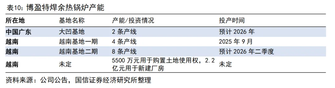 余热锅炉是中大型燃气轮机的必要配套设备,通过实现燃气一蒸汽联合循环发电可大幅提升发电效率。当前AI产业快速发展带来美国数据中心需求爆发,使得电力供需矛盾日益凸显,燃气轮机发电有望成为未来数据中心缺电的主要解决方案,叠加燃气轮机行业本身已进入更新需求主导的上行周期,燃气轮机需求呈现阶段性供不应求的特点,根据IEA与GEV公告,海外巨头GEV预计25年底在手订单将达80GW,订单已排产至2029年,西门子订单亦排产至未来3-4年,两家巨头均宣布扩产以进一步满足市场需求,余热锅炉将同样受益该景气周期。我们测算未来3-5年海外余热锅炉累计需求约500-800亿元,并呈现加速增长态势。博盈特焊可生产余热回收装置及相关部件,具体包括省煤器、蒸发器、过热器、再热器、汽包、集箱、钢结构等,价值占到余热锅炉整体的比例较高,公司2023年在越南投资设立子公司并规划海外产能,截至2025年11月,公司在越南部署的4条产线已投产,还有8条产线预计于2026年上半年投产,2025年12月向越南孙公司增资2.75亿元进一步扩产,海外产能优势显著,有望快速承接北美市场的余热锅炉需求实现高速增长。公司积极布局油气复合管业务,有望受益油气开采深海化和中东本土化带来的旺盛需求