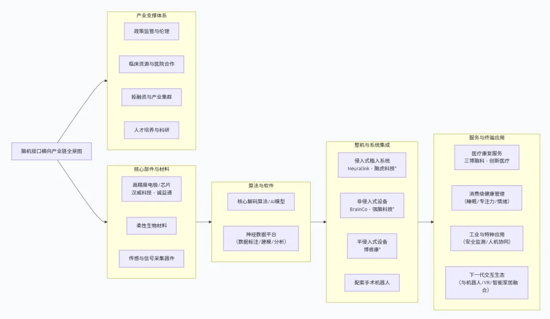 以下思维导图清晰地展示了脑机接口产业从基础技术到终端应用的价值链条(点击查看大图):