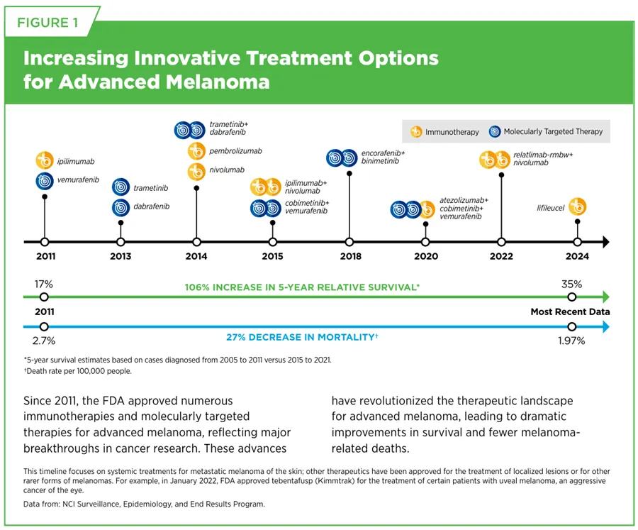 治疗领域方面,2024年7月至2025年6月期间,FDA批准20种全新抗癌药物、8种已获批药物新增适应症、2种癌症治疗设备(分别用于肺癌治疗与宫颈癌筛查)及2种结直肠癌微创筛查技术。此外,人工智能(AI)辅助医疗设备与软件在癌症早期检测中的应用进展显著,报告罗列该周期内FDA批准的多款AI工具,覆盖癌症风险预测、临床诊断辅助等核心场景。免疫治疗与精准治疗领域的突破尤为亮眼:自2011年首款免疫检查点抑制剂获批以来,已有15款该类药物用于20余种癌症治疗;过继性T细胞疗法(含CAR-T、TIL、TCR-T)获批9款,双特异性T细胞衔接器获批9款,显著重塑晚期黑色素瘤、肺癌、肾癌等难治性癌症的治疗格局。三、癌症发病与疾病负担:进展不均与健康不平等仍是核心挑战