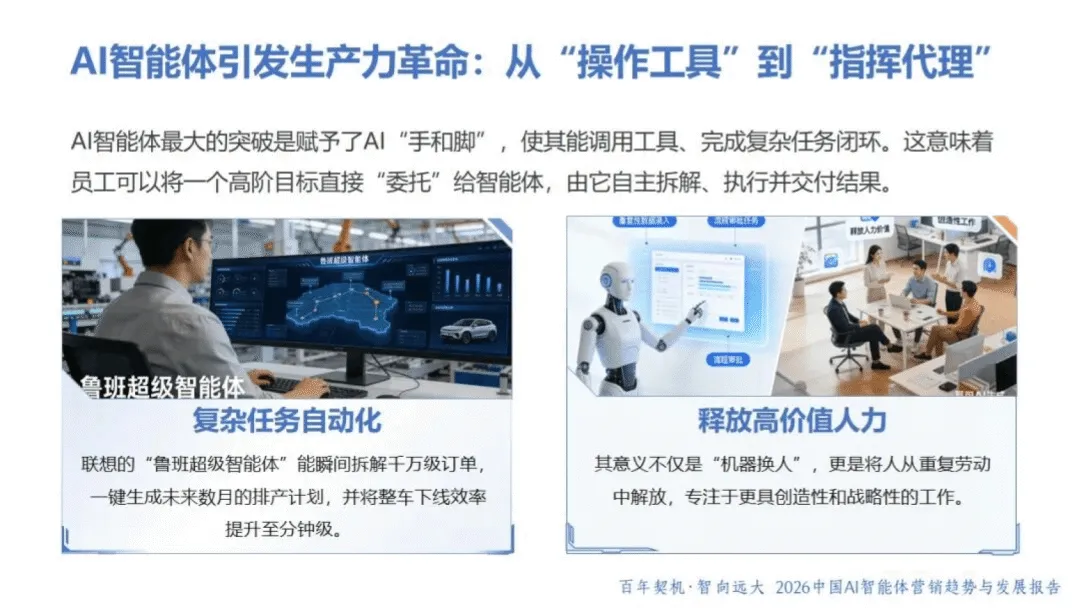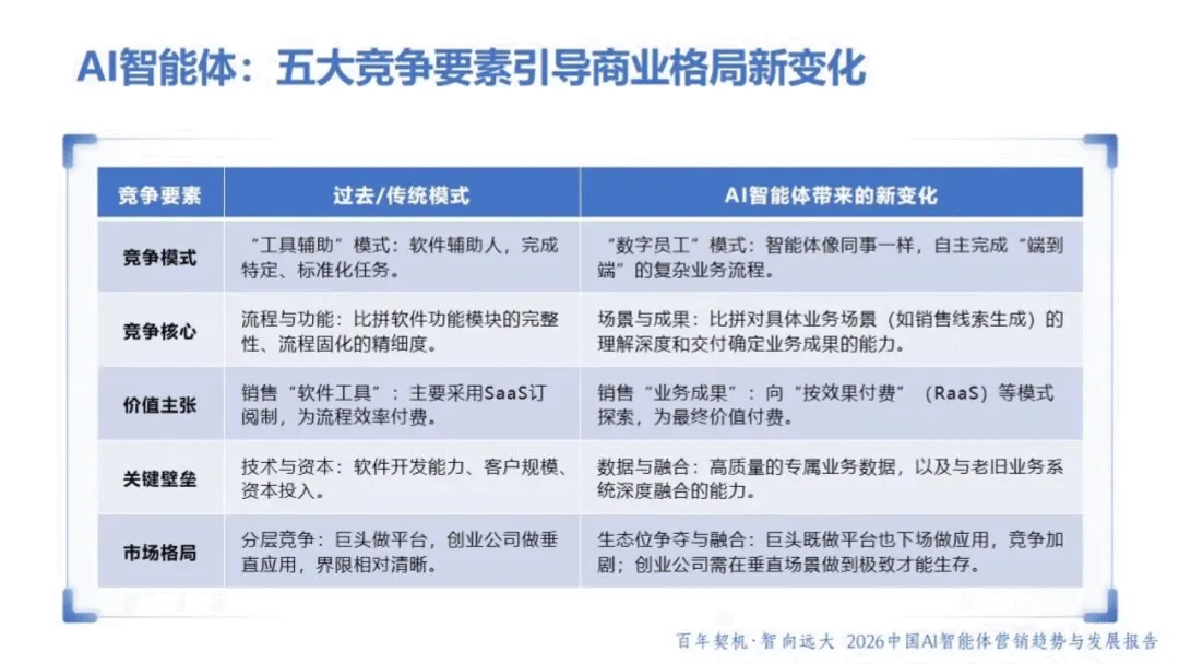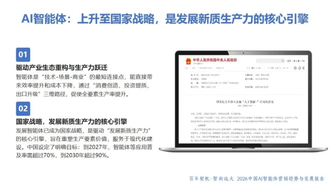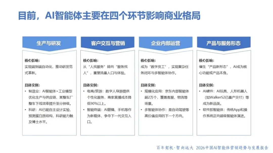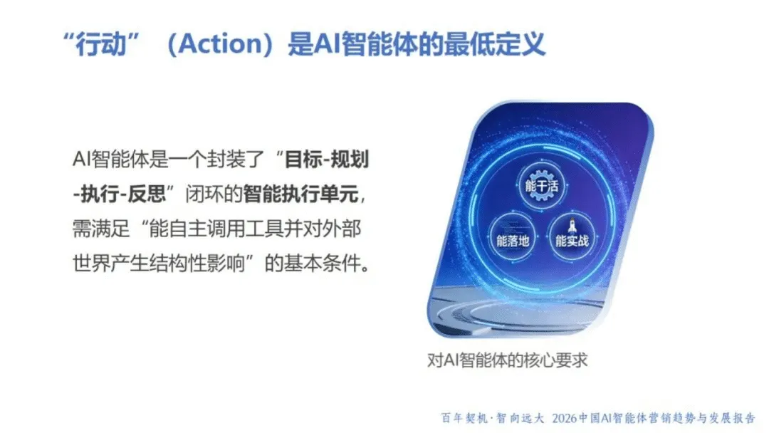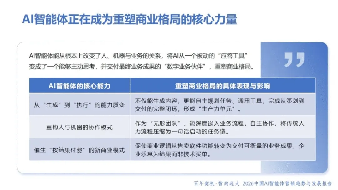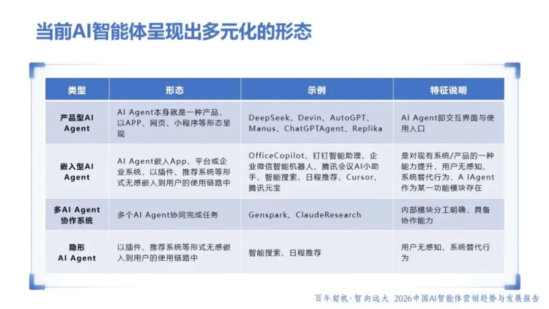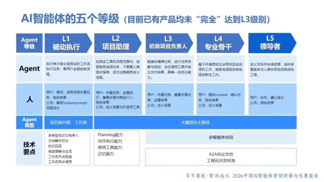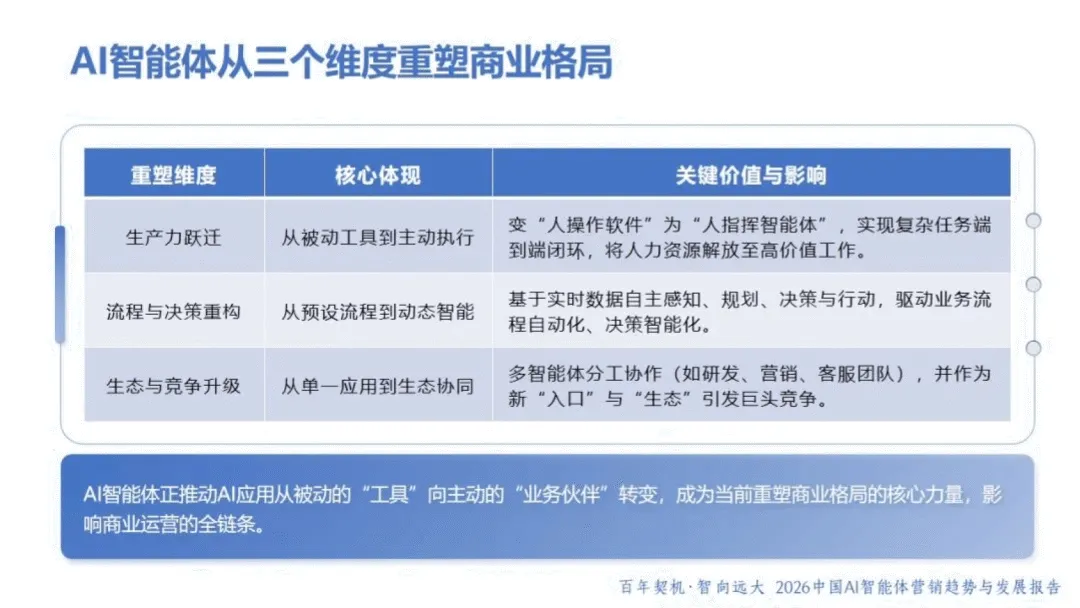 AI 智能体作为具备自主感知、决策与执行能力的 “数字业务伙伴”,正重塑商业格局与营销范式。2026 年,AI 智能体已从被动工具升级为主动参与者,呈现产品型、嵌入型等多元形态,虽暂未完全达到 L3 级别,但在生产力跃迁、流程重构、生态升级等维度推动行业变革。