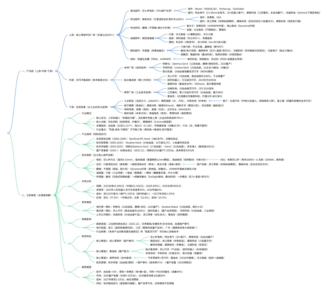 投资机会聚焦三大主线:1)核心零部件国产替代(空心杯电机、微型丝杠、触觉传感器);2)高自由度集成商(覆盖工业/医疗场景);3)跨界协同企业(汽车零部件+灵巧手)。政策端,工信部标委会成立加速行业标准化,2026年特斯拉量产将成为行业放量“催化剂”。