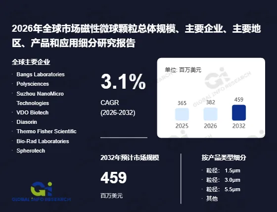 全球磁性微球颗粒市场呈现稳步增长态势,据调研数据显示,2025年全球该领域市场收入约为365百万美元,预计到2032年将增长至459百万美元,在2026至2032年的预测期内,年复合增长率(CAGR)将达到3.1%。(数据来源:《2026年全球市场磁性微球颗粒总体规模、主要生产商、主要地区、产品和应用细分研究报告》 出版商:环洋市场咨询(Global Info Research))