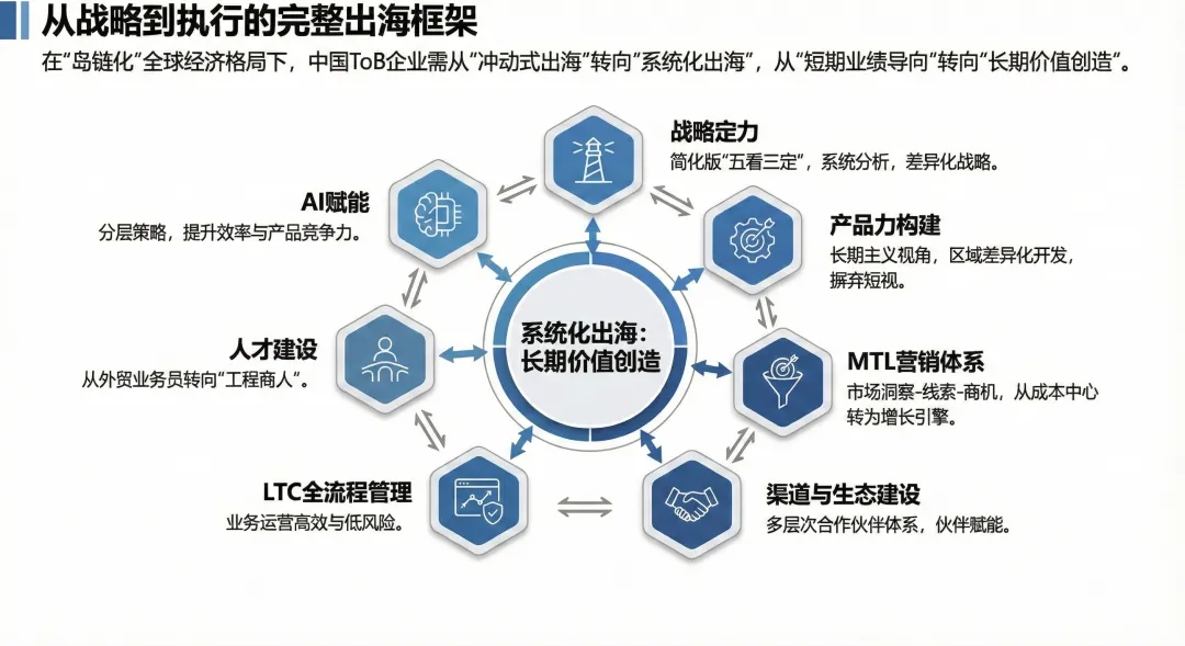 在"岛链化"的全球经济格局下,中国ToB企业出海需要从”冲动式出海"转向"系统化出海",从"短期业绩导向"转向"长期价值创造"。本文提出的七点建议,构成了一个从战略到执行的完整出海框架。