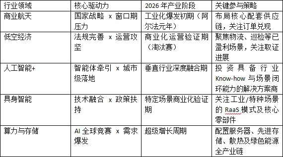 华智堂研究院基于对上述十大行业的交叉分析,提炼出如下策略矩阵,以揭示不同行业在2026年的核心投资逻辑与参与阶段: