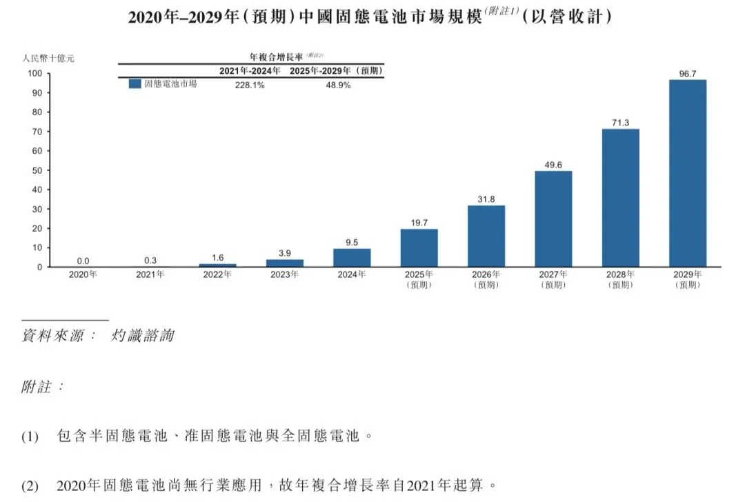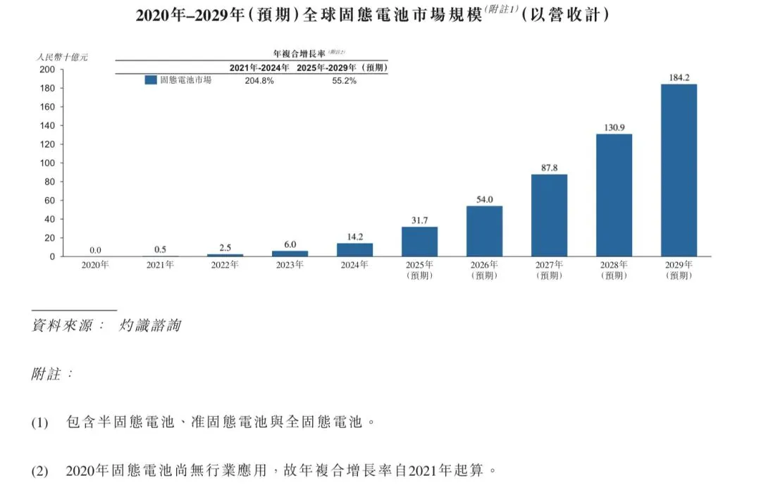 2021年,全球固态电池市场规模基数较小,约为人民币5亿元,以研发和示范项目为主。到2024年,随半固态电池技术开始实现小批量量产,并应用于高端车型及消费电子领域,全球固态电池的市场规模迅速增长至人民币142亿元。2021年至2024年的年复合增长率为204.8%。随车企积极推动固态电池产业化,无人机、储能等场景对于长续航高安全电池需求持续提升,预期到2029年,全球固态电池的市场规模将达到人民币1,842亿元,未来五年的年复合增长率为55.2%。